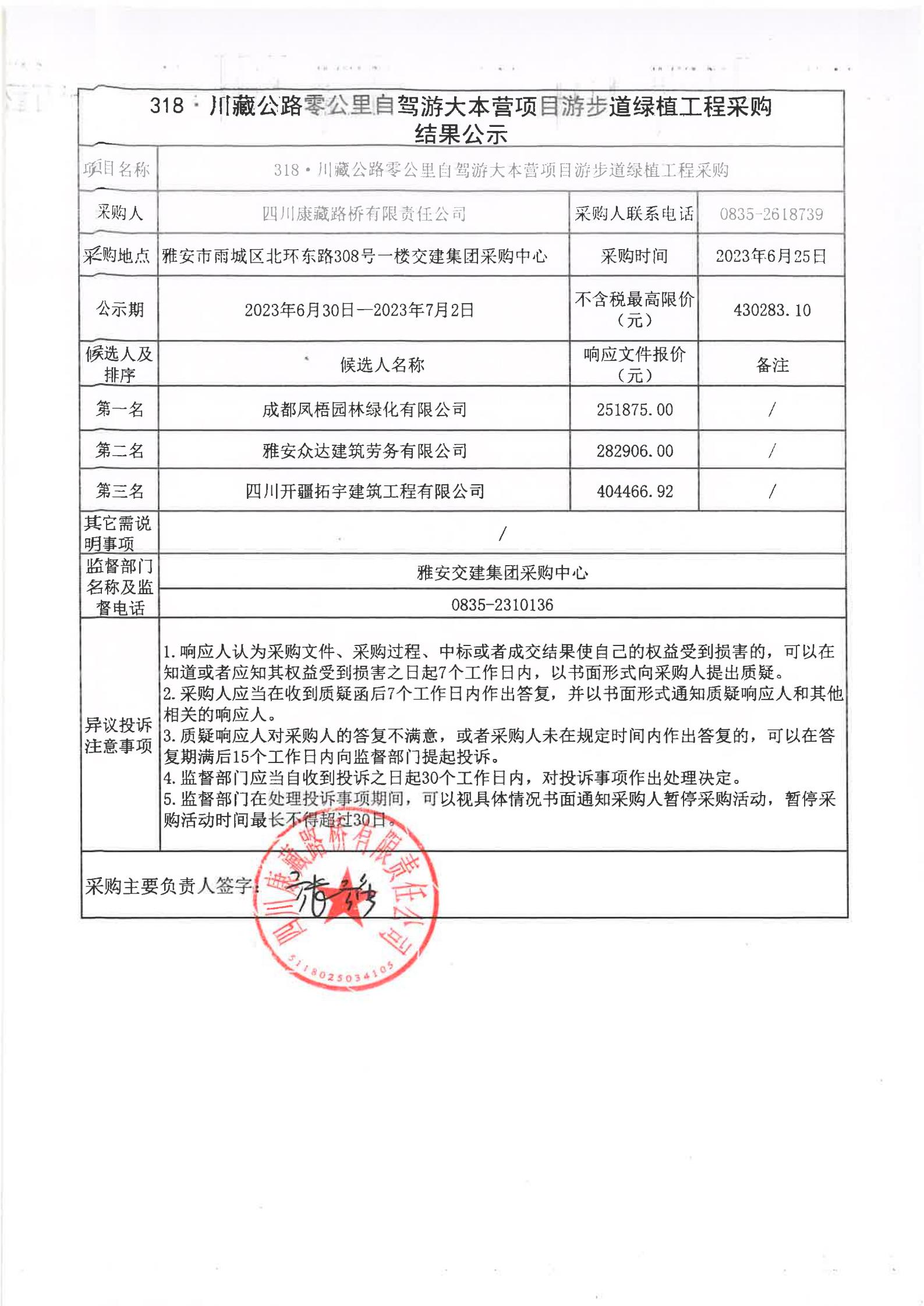 四川康藏路桥有限责任公司318·川藏公路零公里自驾游大本营项目游步道绿植工程采购结果公示