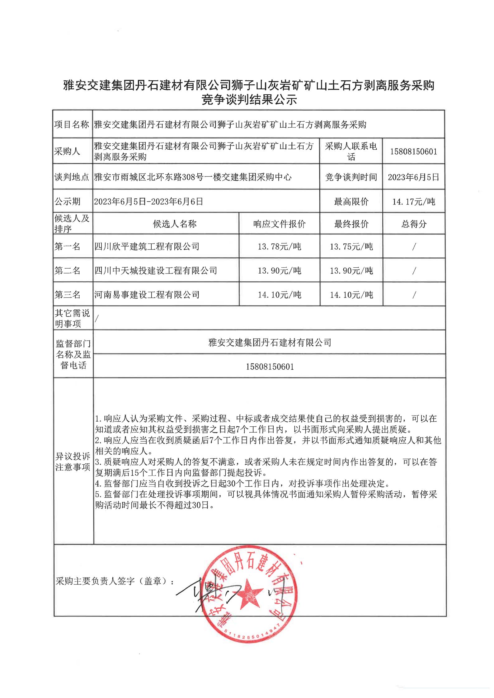 米兰体育-米兰(中国)官网 丹石建材有限公司狮子山灰岩矿矿山土石方剥离服务采购竞争谈判结果公示