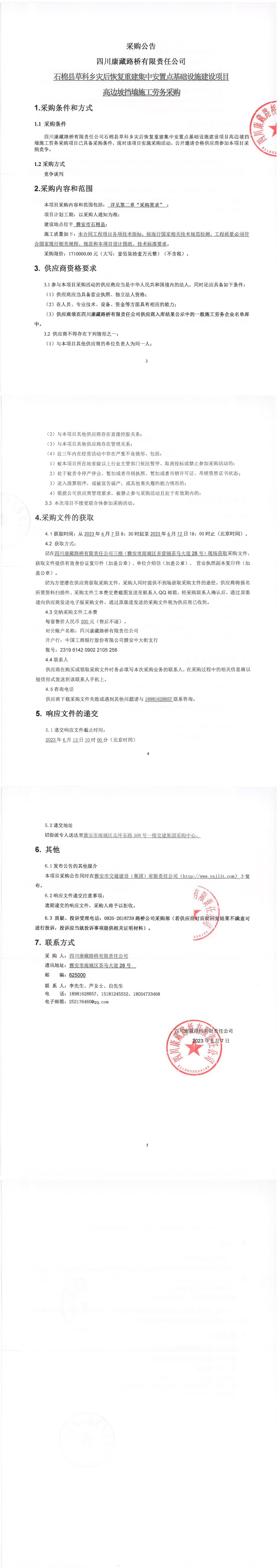 四川康藏路桥有限责任公司石棉县草科乡灾后恢复重建集中安置点基础设施建设项目高边坡挡墙施工劳务采购