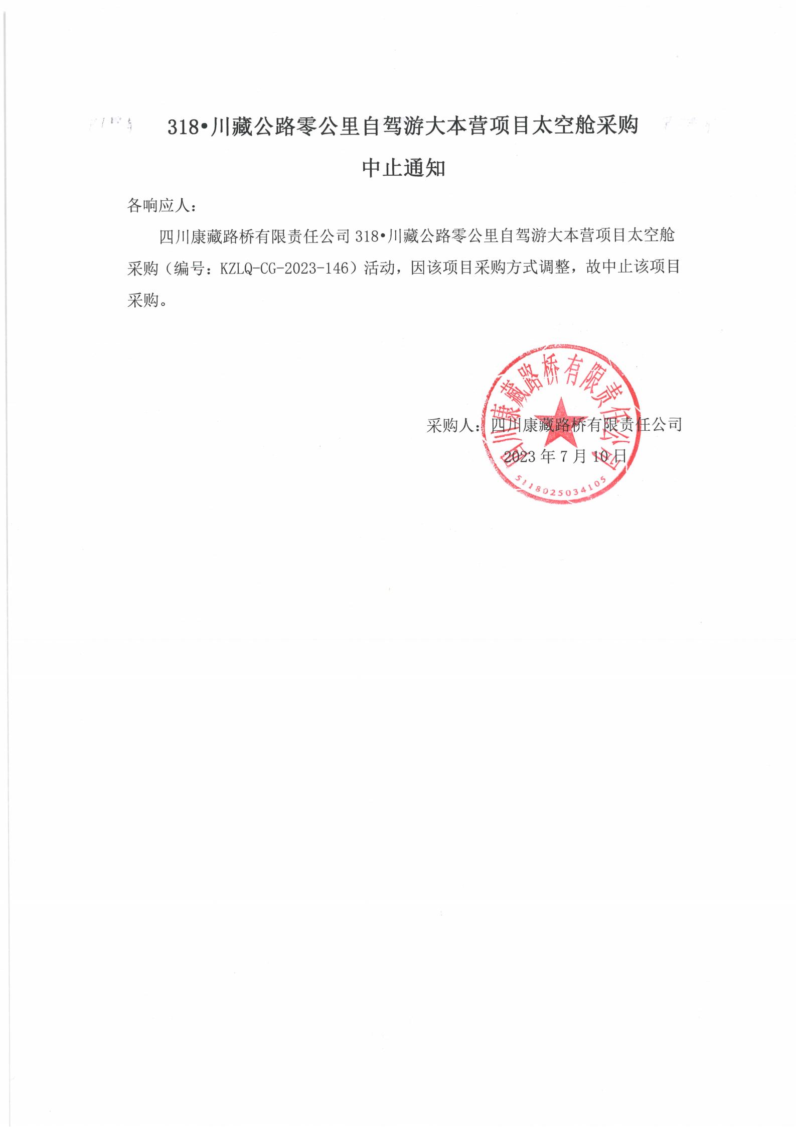 四川康藏路桥有限责任公司318·川藏公路零公里自驾游大本营项目太空舱采购中止通知