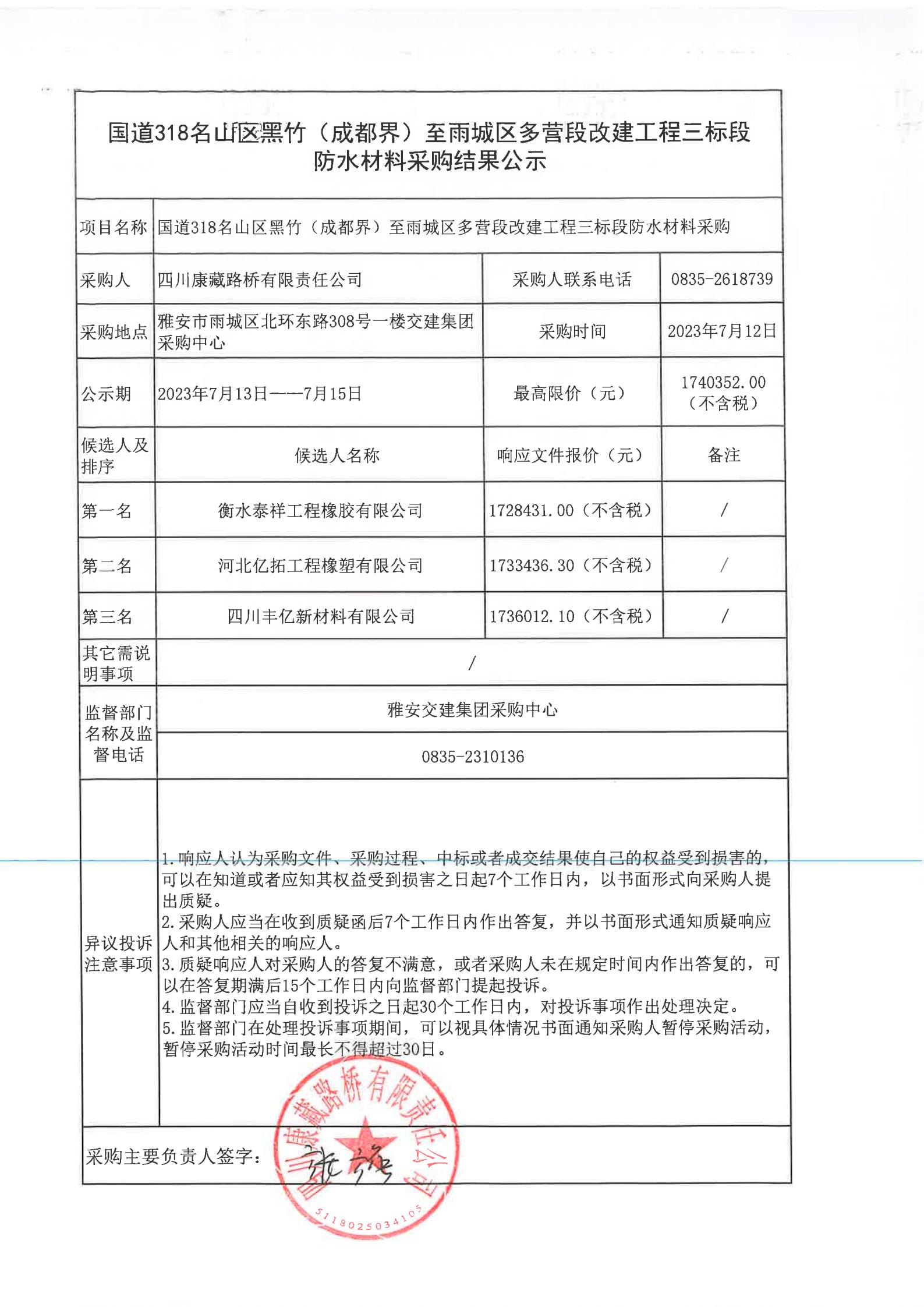 四川康藏路桥有限责任公司国道318名山区黑竹(成都界)至雨城区多营段改建工程三标段防水材料采购结果公示