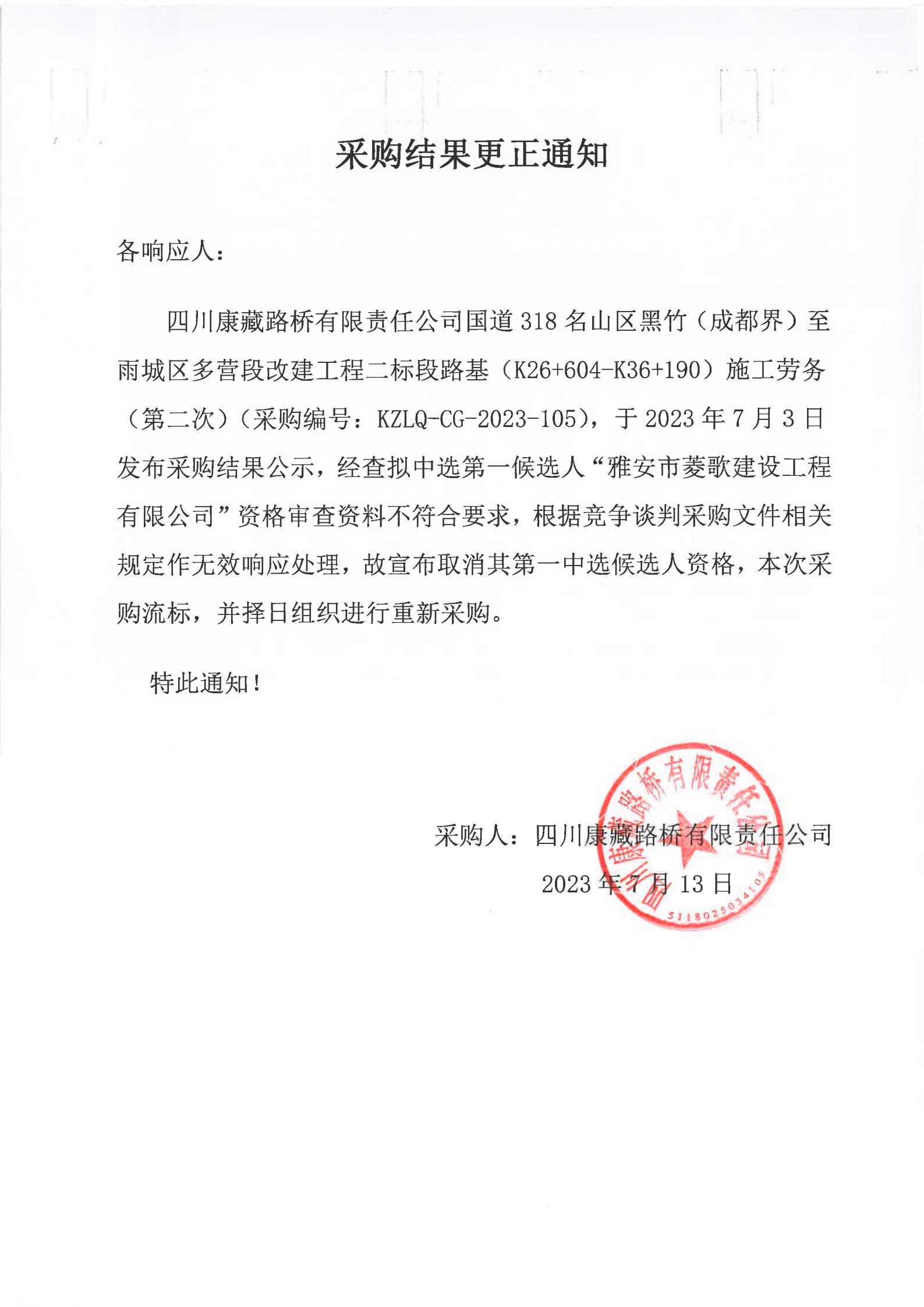 四川康藏路桥有限责任公司国道318名山区黑竹(成都界)至雨城区多营段改建工程二标段路基(K26+604-K36+190)施工劳务(第二次)采购结果更正通知