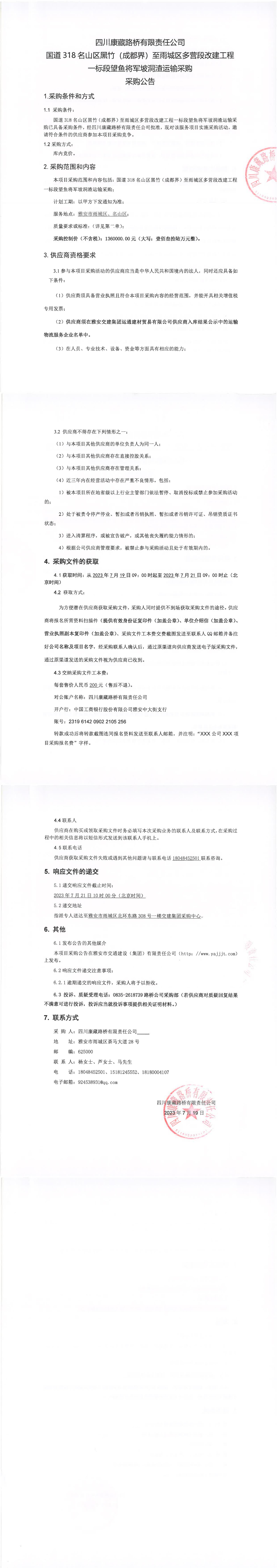 四川康藏路桥有限责任公司国道318名山区黑竹(成都界)至雨城区多营段改建工程一标段望鱼将军坡洞渣运输采购公告