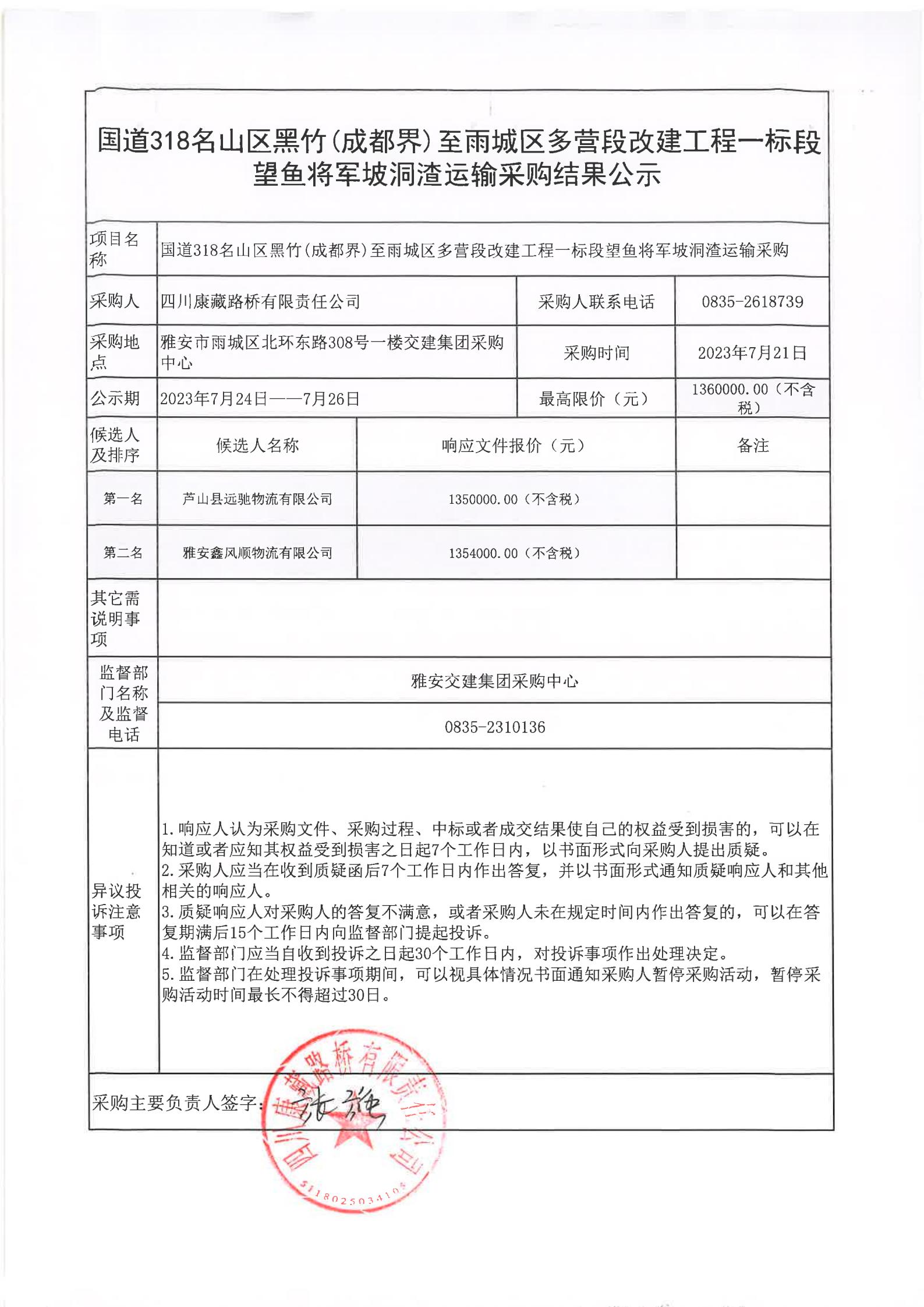 四川康藏路桥有限责任公司国道318名山区黑竹(成都界)至雨城区多营段改建工程一标段望鱼将军坡洞渣运输采购结果公示