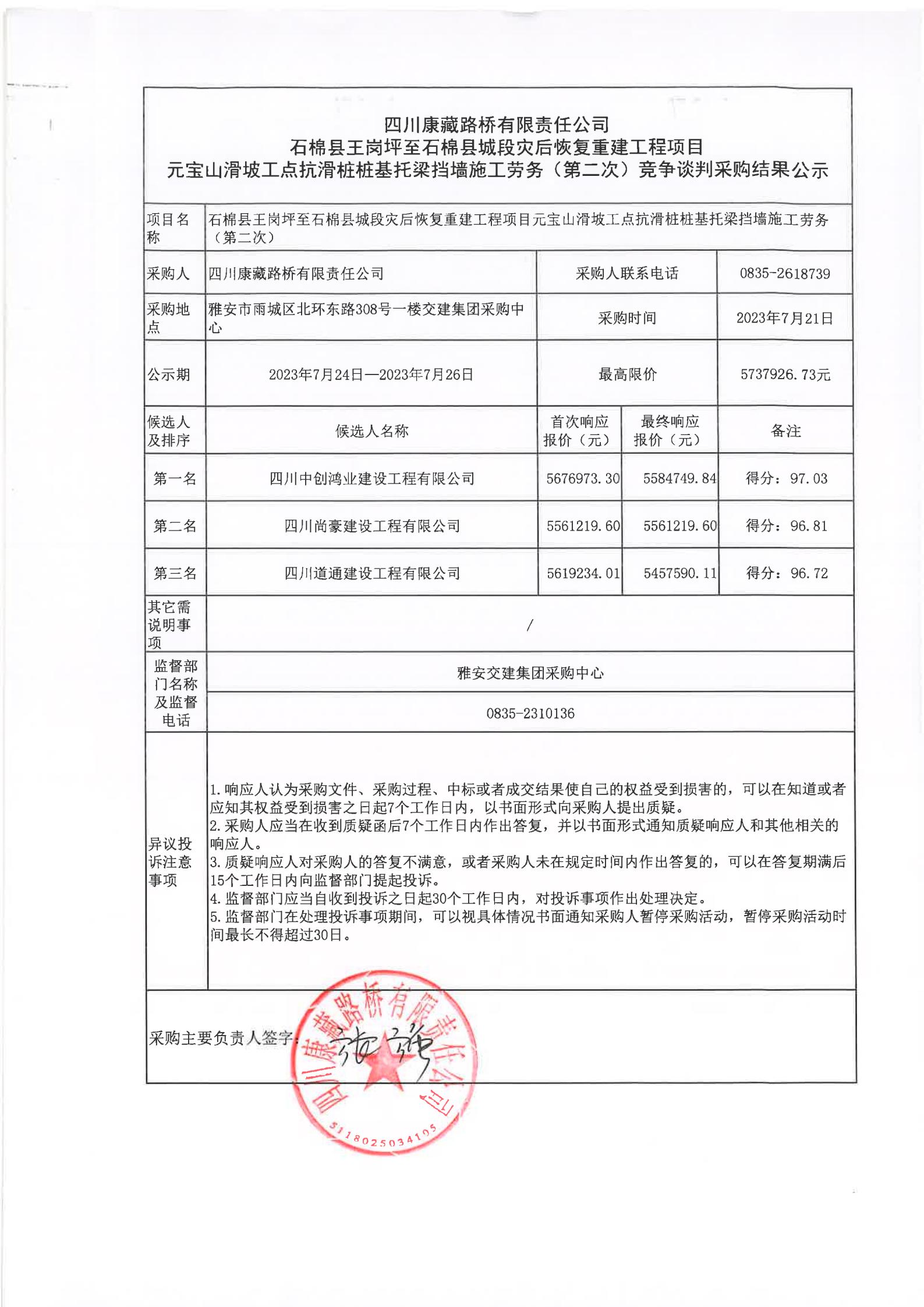 四川康藏路桥有限责任公司石棉县王岗坪至石棉县城段灾后恢复重建工程项目元宝山滑坡工点抗滑桩桩基托梁挡墙施工劳务(第二次)竞争谈判采购结果公示