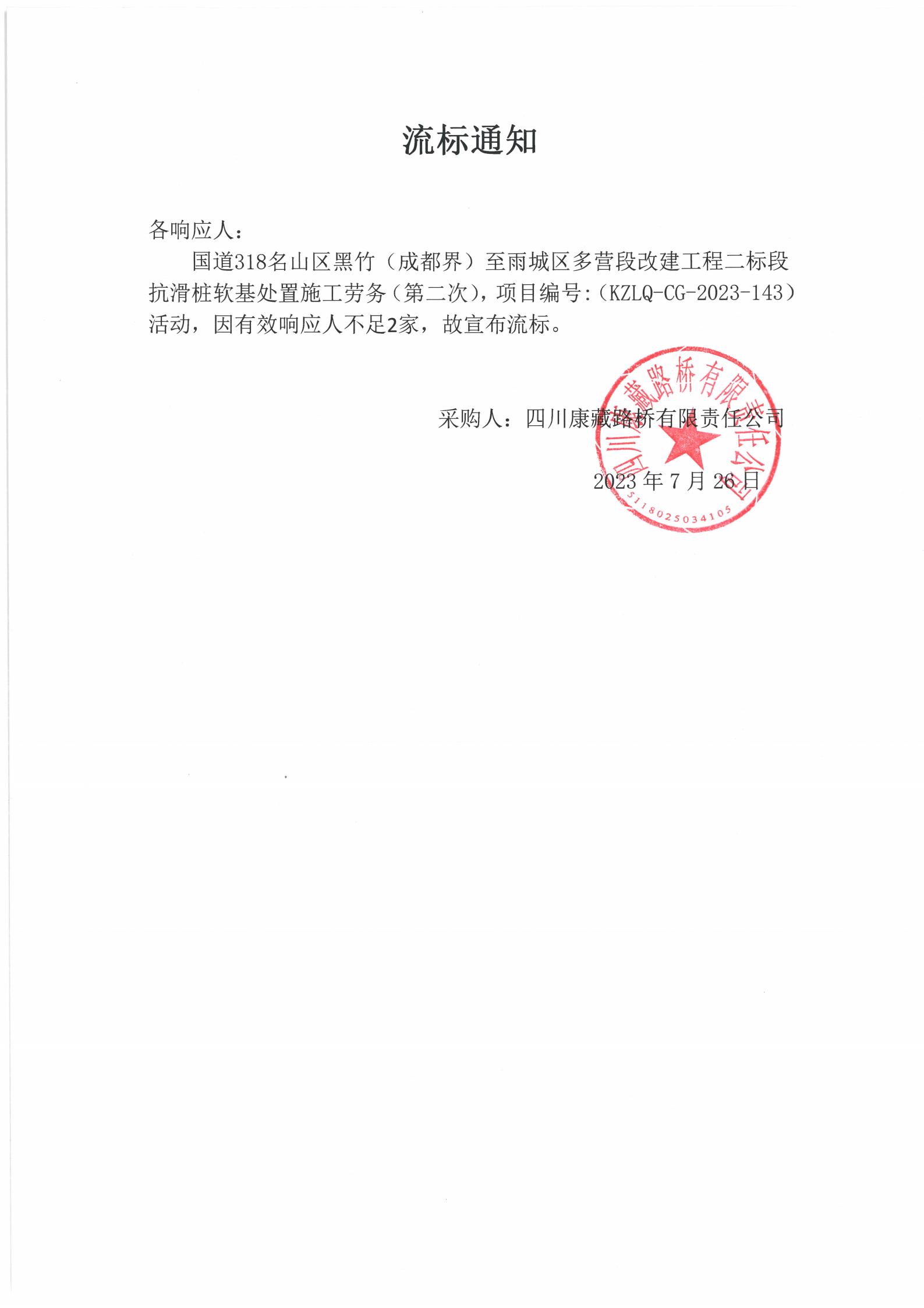 四川康藏路桥有限责任公司国道318名山区黑竹(成都界)至雨城区多营段改建工程二标段抗滑桩软基处置施工劳务(第二次)流标通知