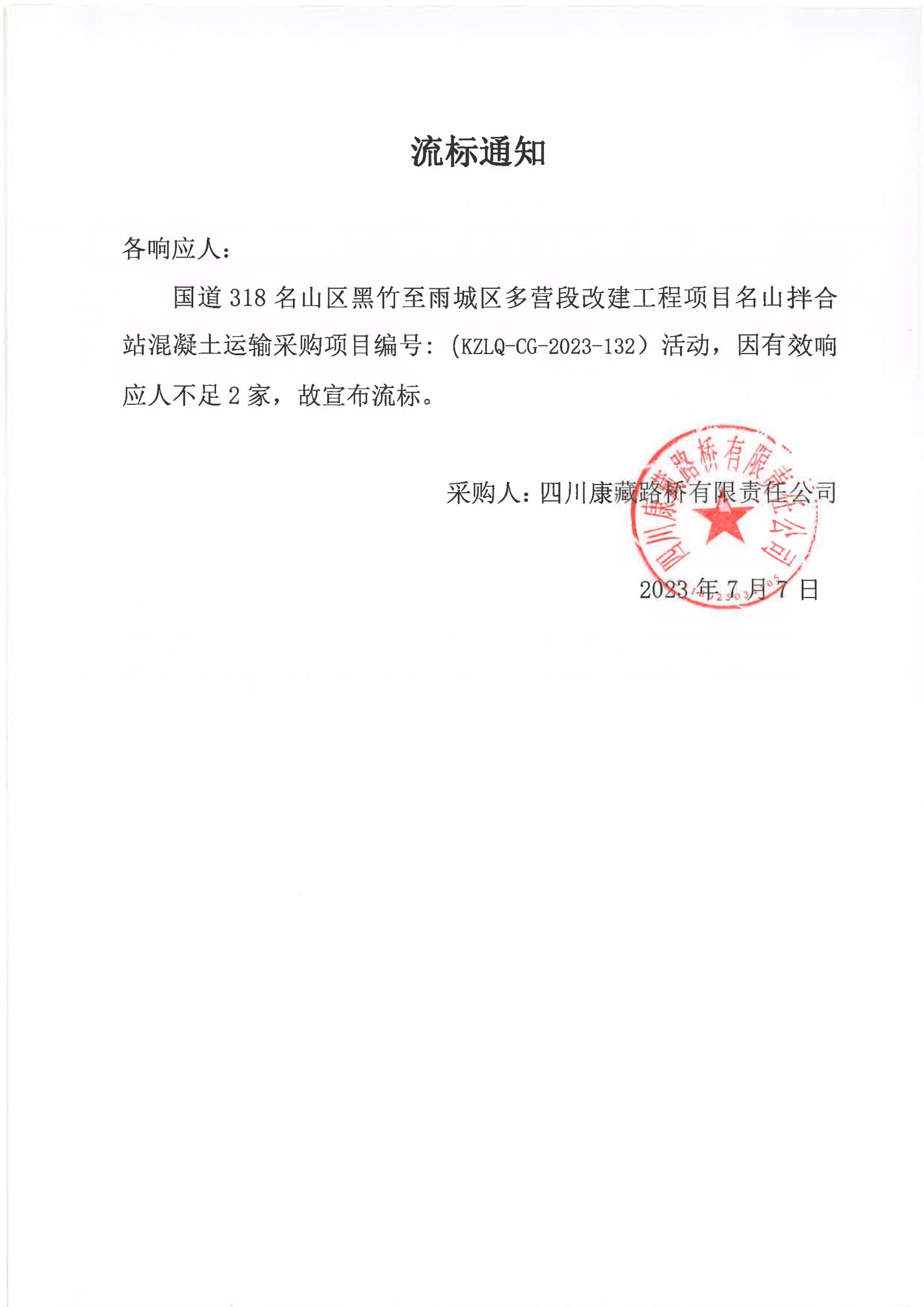 四川康藏路桥有限责任公司国道318名山区黑竹(成都界)至雨城区多营段改建工程项目名山拌合站混凝土运输采购流标通知