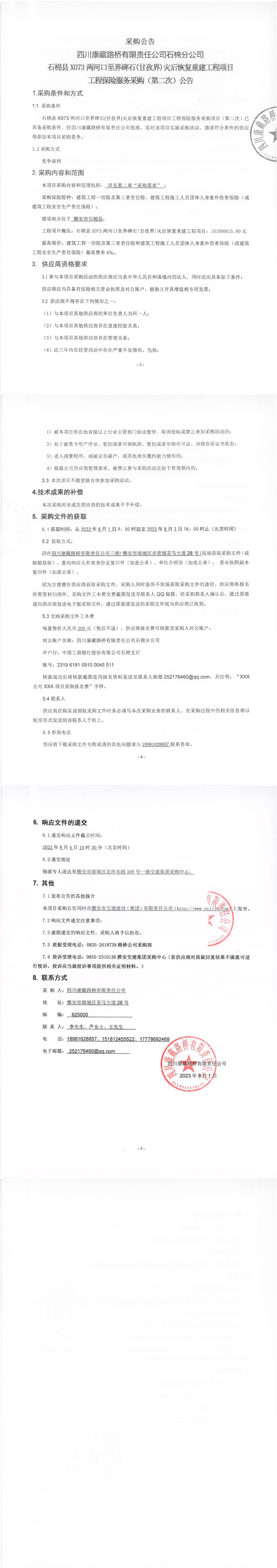 四川康藏路桥有限责任公司石棉分公司石棉县X073两河口至界碑石(甘孜界)灾后恢复重建工程项目工程保险服务采购(第二次)公告