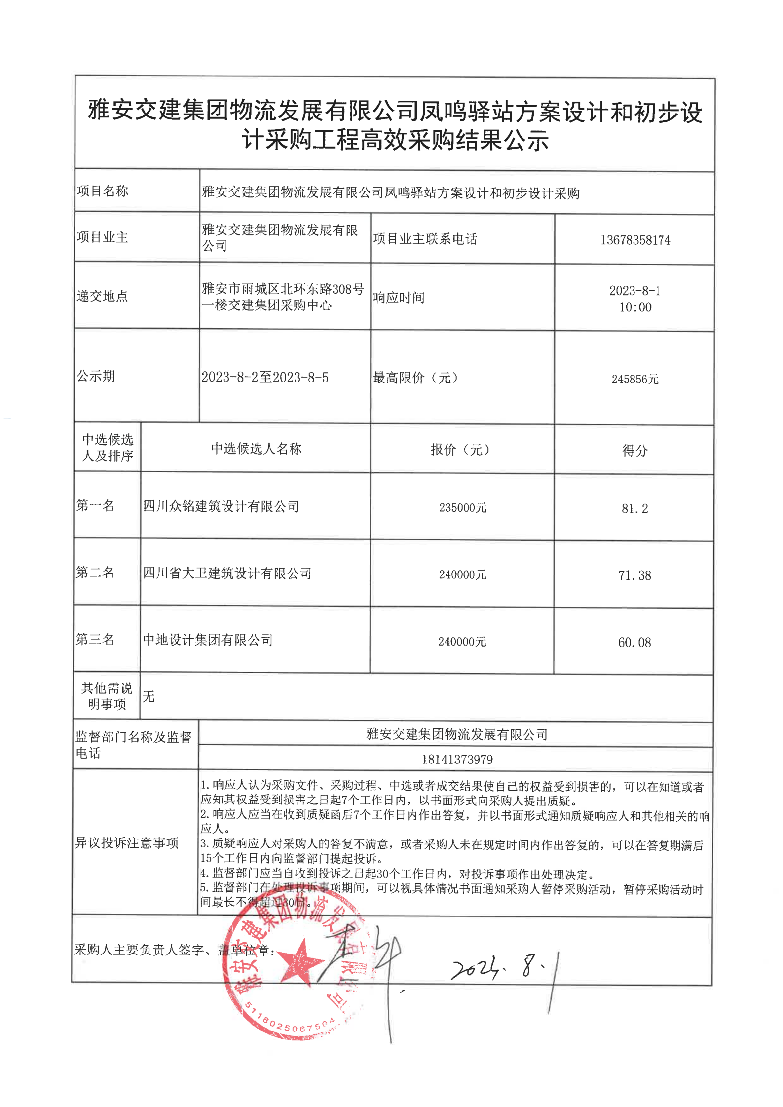 米兰体育-米兰(中国)官网 物流发展有限公司凤鸣驿站方案设计和初步设计采购工程高效采购结果公示