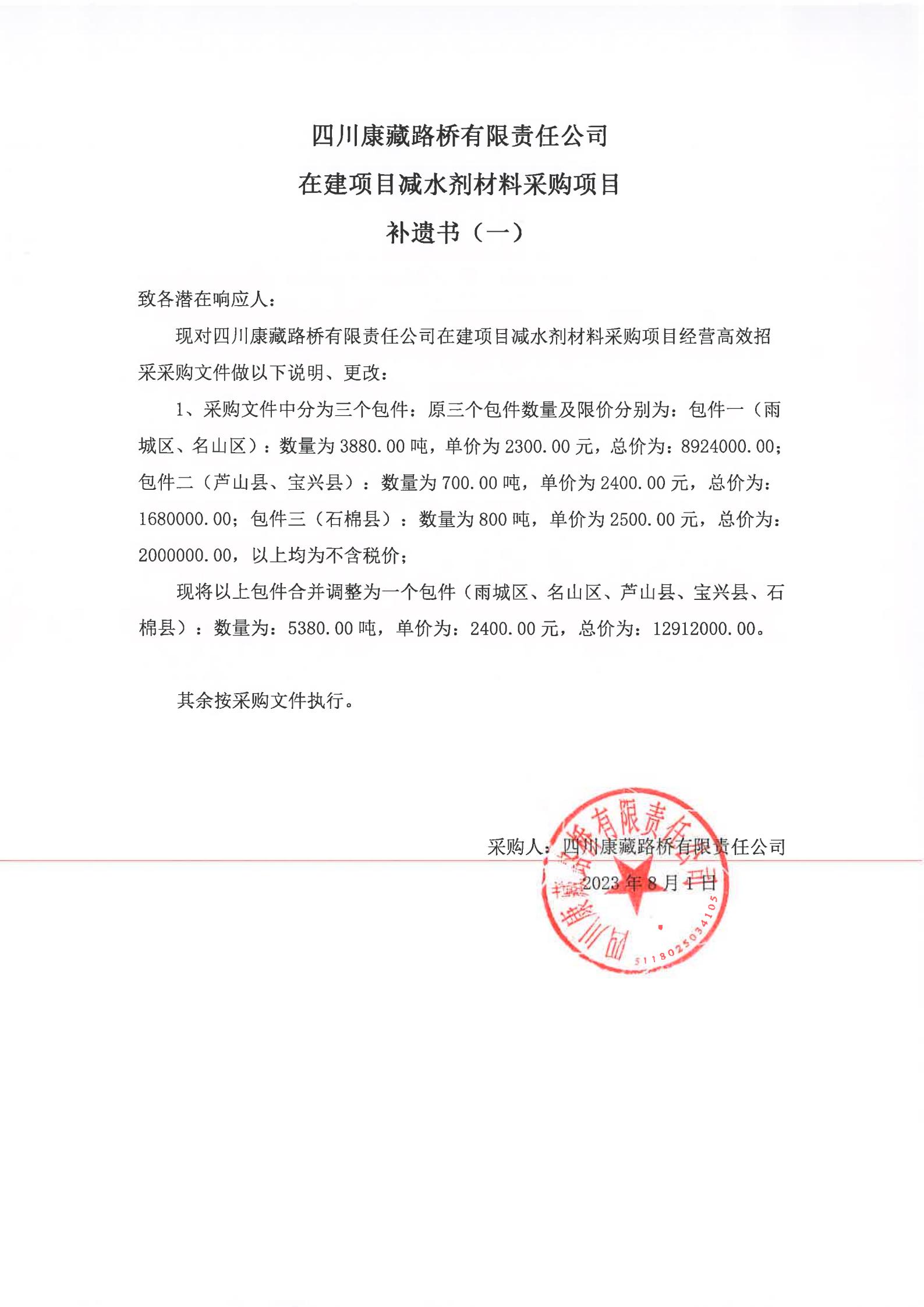 四川康藏路桥有限责任公司在建项目减水剂材料采购项目补遗书(一)