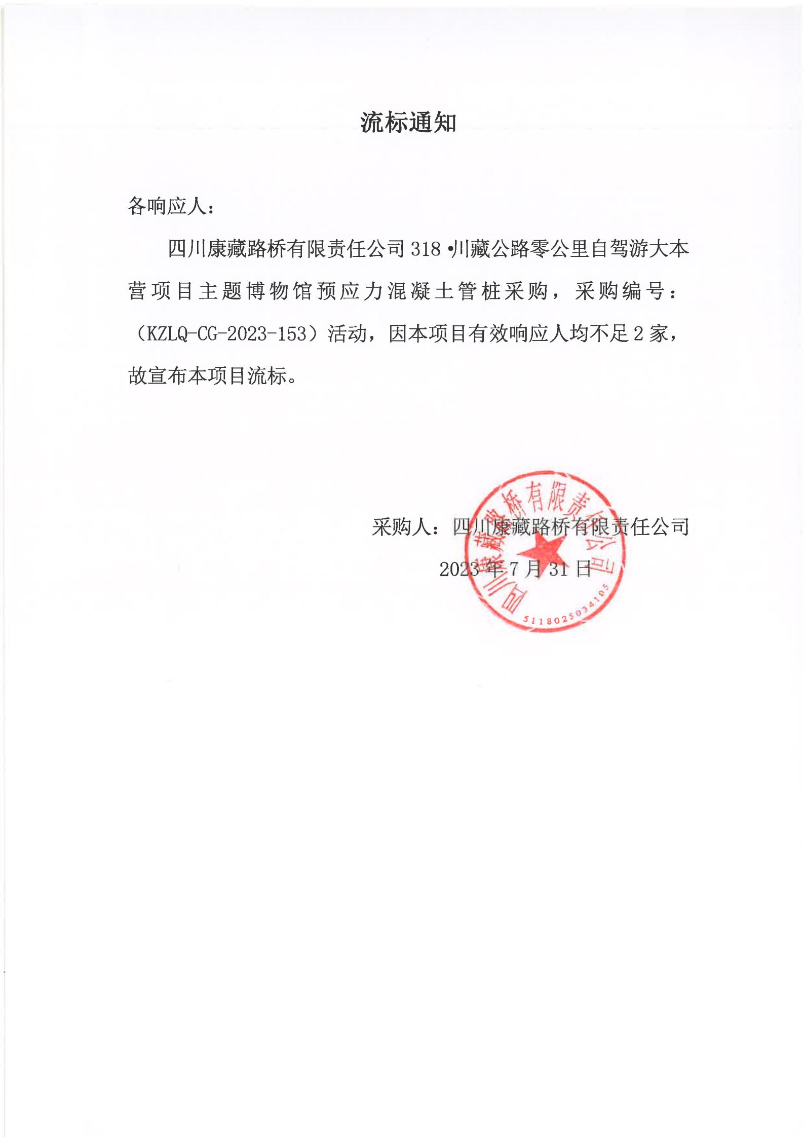 四川康藏路桥有限责任公司318·川藏公路零公里自驾游大本营项目主题博物馆预应力混凝土管桩采购流标通知