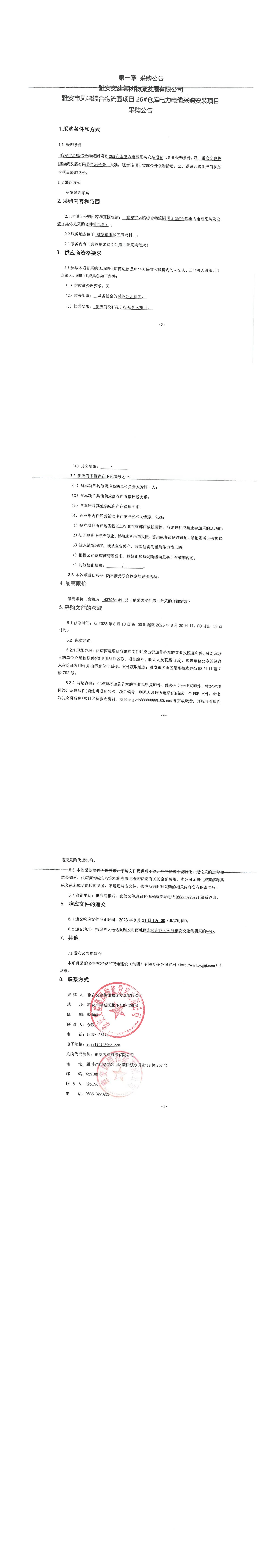 米兰体育-米兰(中国)官网 物流发展有限公司雅安市凤鸣综合物流园项目26#仓库电力电缆采购安装项目采购公告