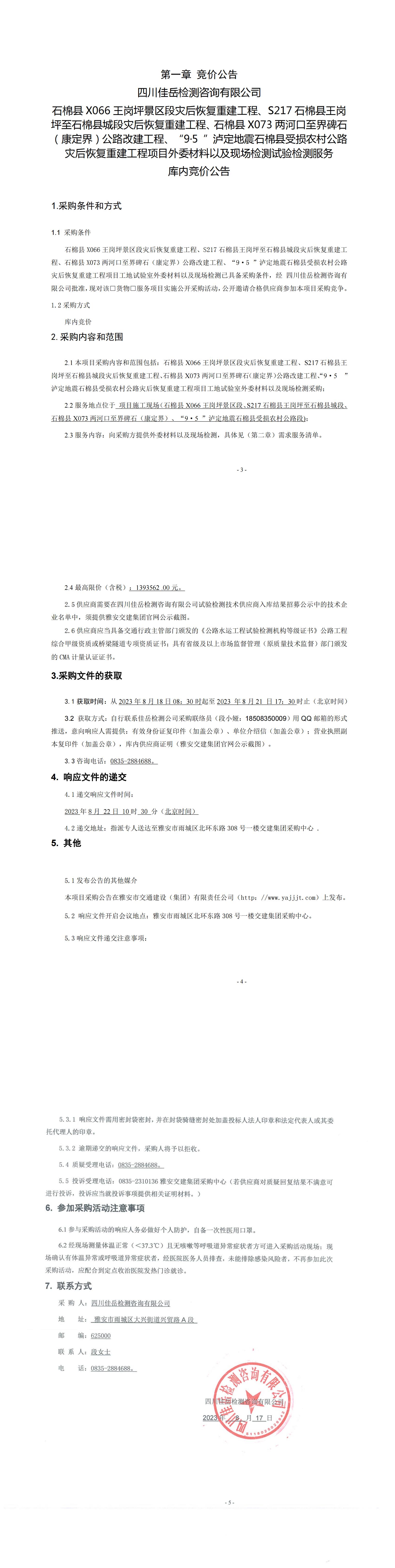四川佳岳检测咨询有限公司石棉县X066王岗坪至王岗坪景区段灾后恢复重建工程、S217石棉县王岗坪至石棉县城段灾后恢复重建工程、石棉县X073两河口至界碑石(康定界)公路改建工程、“9·5”泸定地震石棉县受损农村公路灾后恢复重建工程项目外委材料以及现场检测试验检测服务库内竞价公告