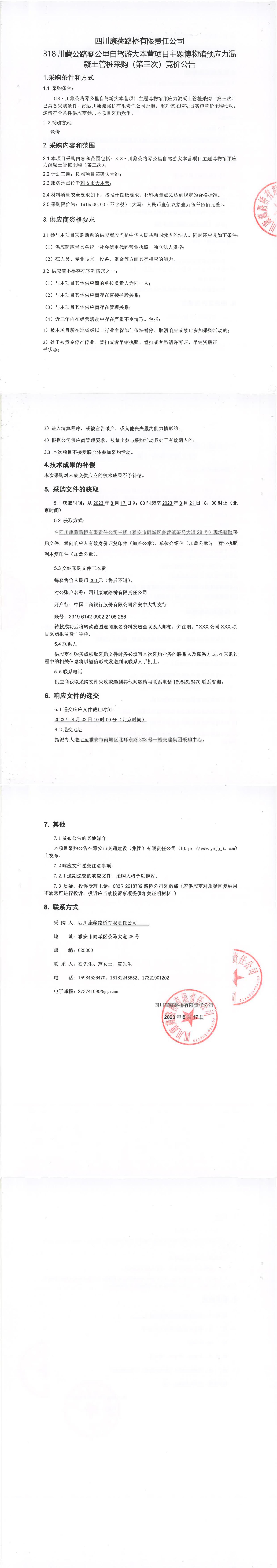 四川康藏路桥有限责任公司318·川藏公路零公里自驾游大本营项目主题博物馆预应力混凝土管桩采购(第三次)竞价公告