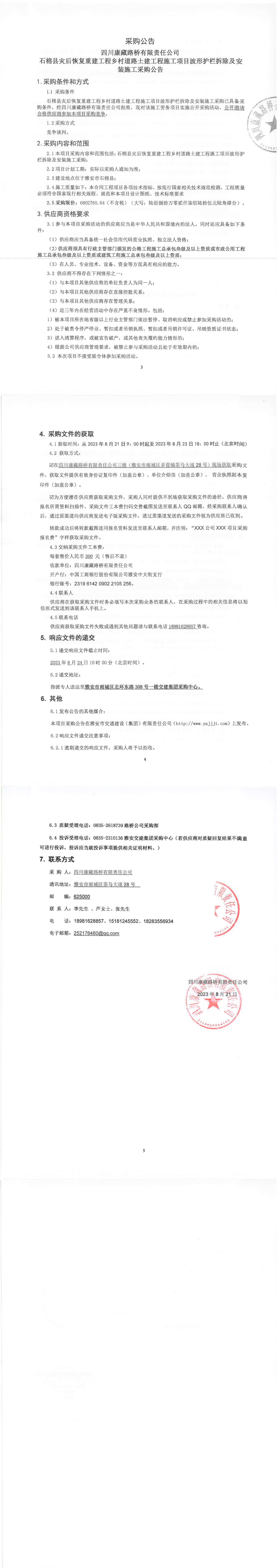 四川康藏路桥有限责任公司石棉县灾后恢复重建工程乡村道路土建工程施工项目波形护栏拆除及安装施工采购公告