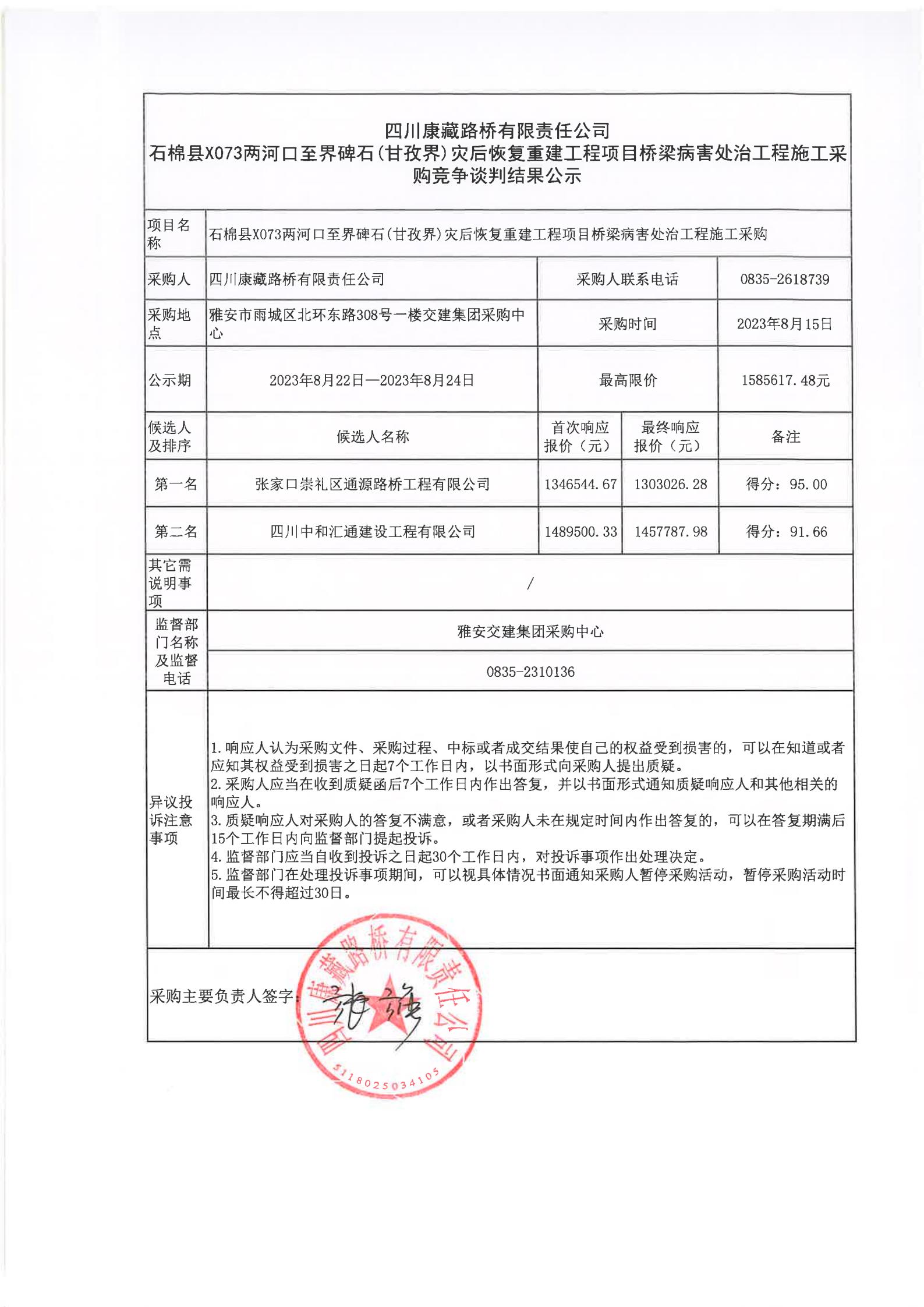 四川康藏路桥有限责任公司石棉县X073两河口至界碑石(甘孜界)灾后恢复重建工程项目桥梁病害处治工程施工采购竞争谈判结果公示