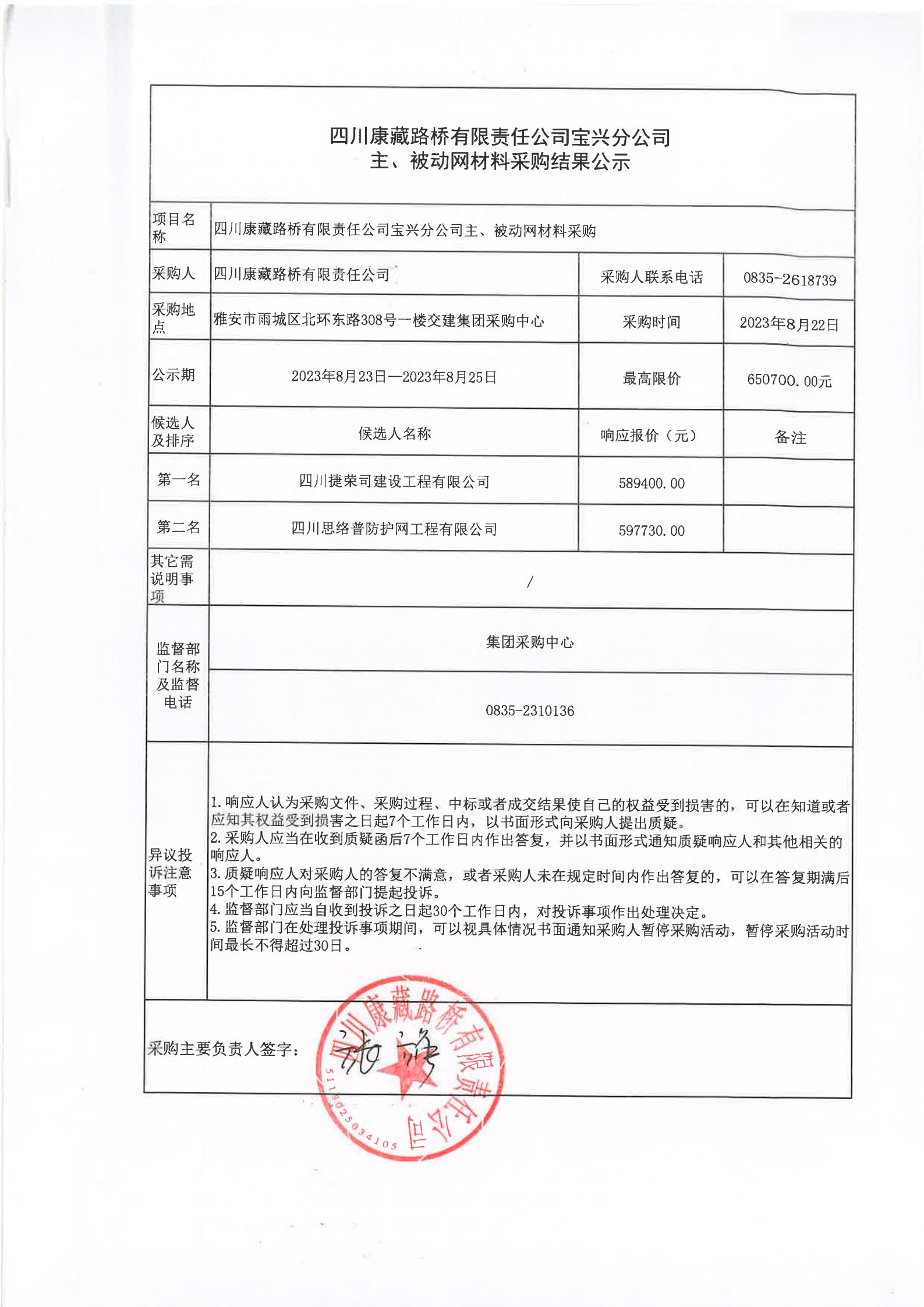 四川康藏路桥有限责任公司宝兴分公司主、被动网材料采购结果公示