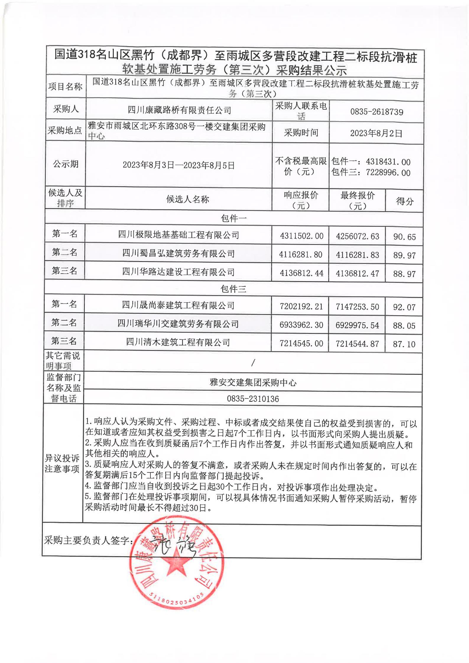 四川康藏路桥有限责任公司国道318名山区黑竹(成都界)至雨城区多营段改建工程二标段抗滑桩软基处置施工劳务(第三次)采购结果公示