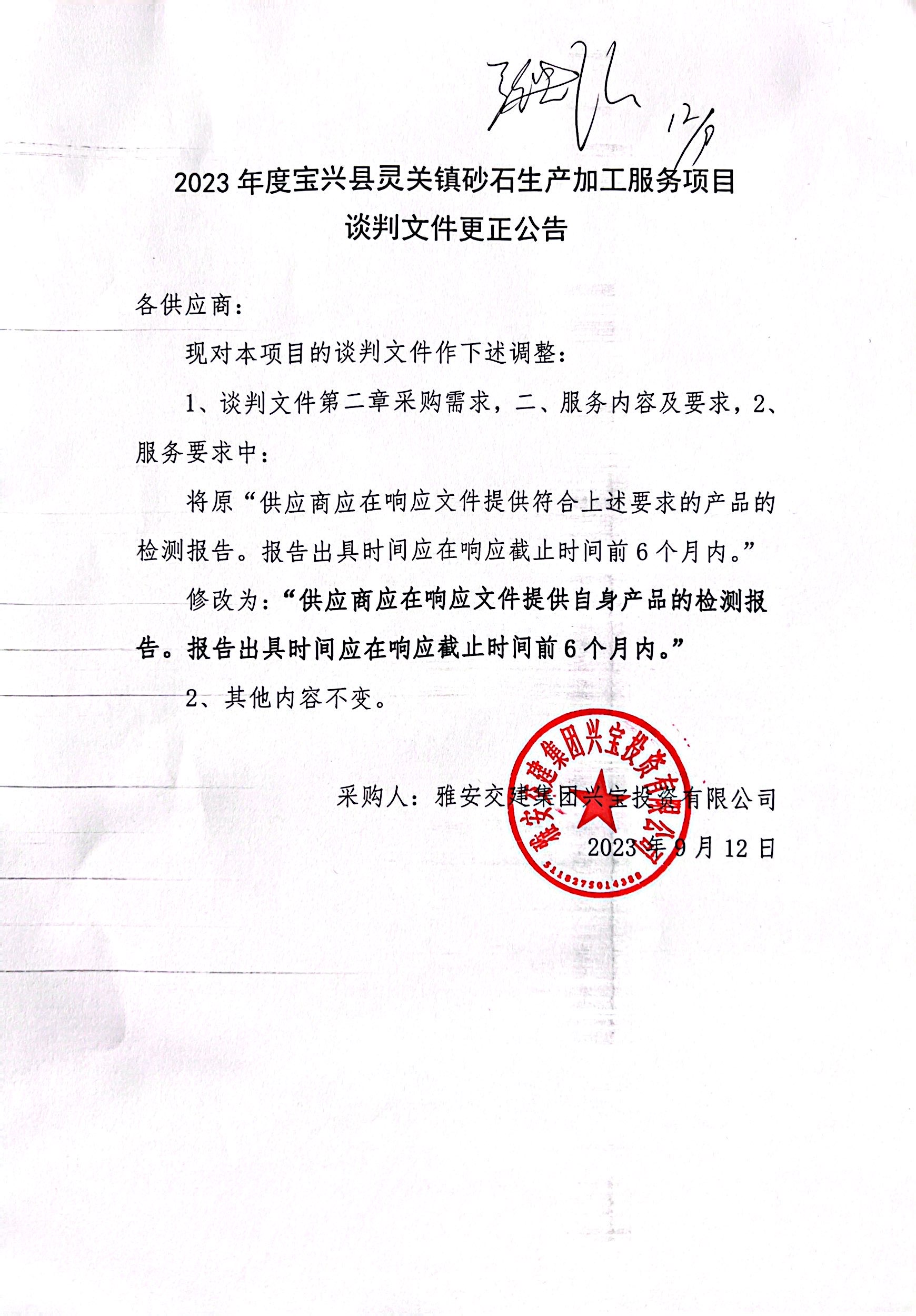 米兰体育-米兰(中国)官网 兴宝投资有限公司2023年度宝兴县灵关镇砂石生产加工服务项目谈判文件更正公告