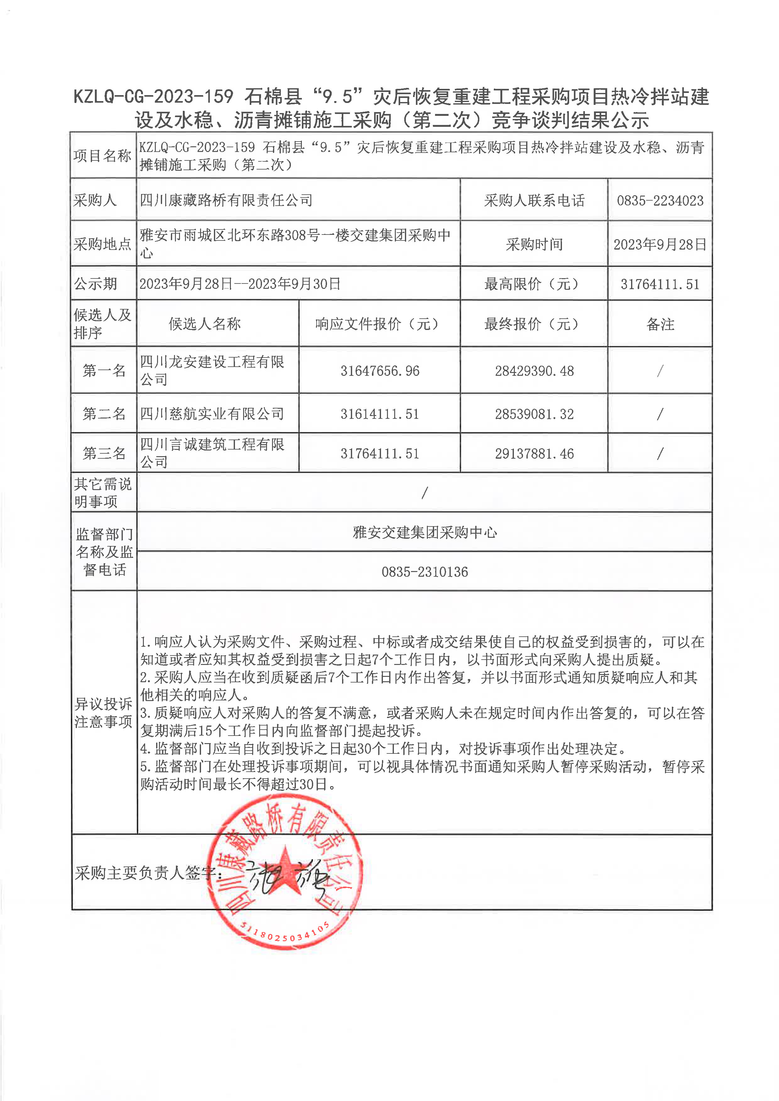 四川康藏路桥有限责任公司石棉县“9.5”灾后恢复重建工程采购项目热冷拌站建设及水稳、沥青摊铺施工采购(第二次)竞争谈判结果公示