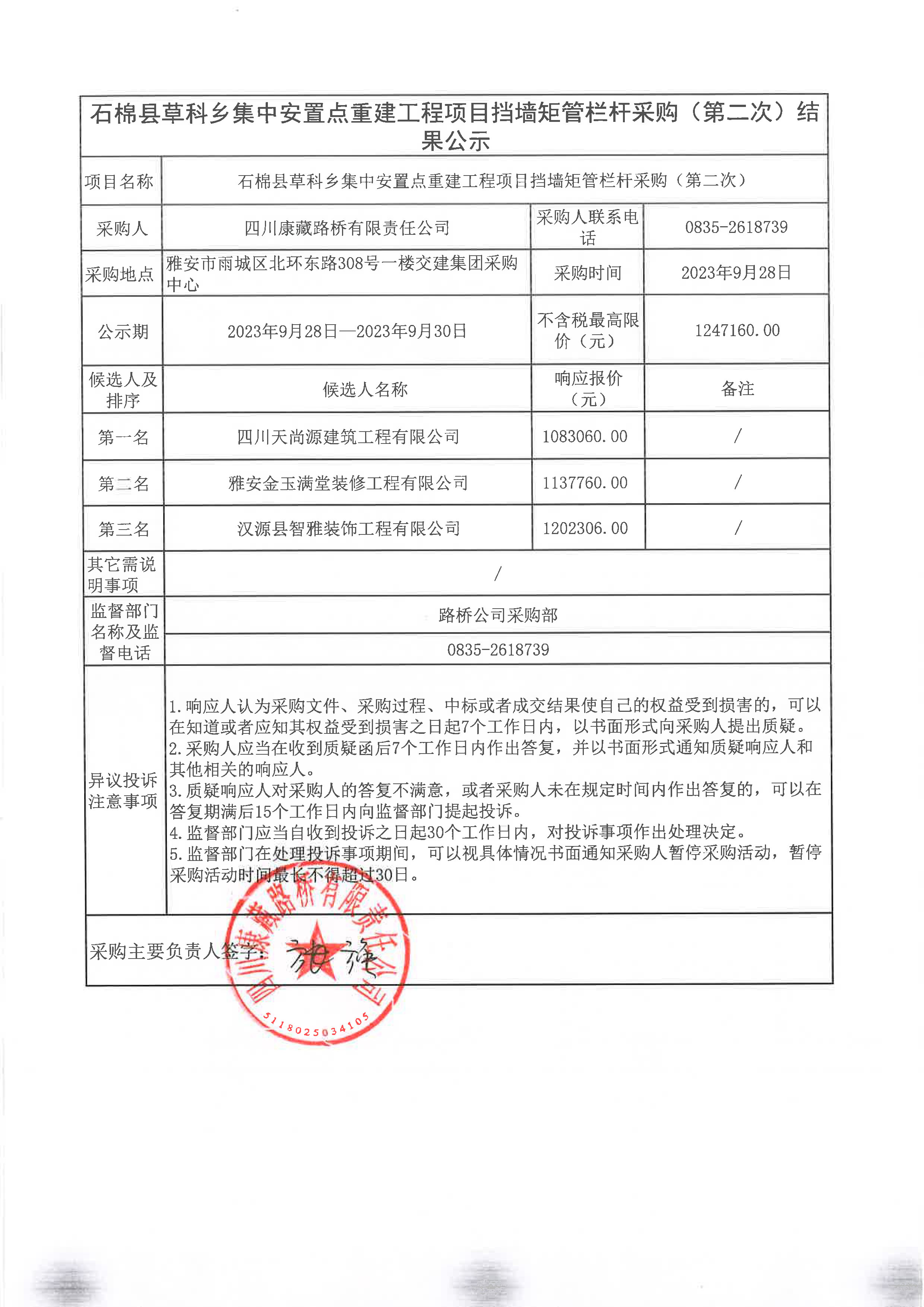四川康藏路桥有限责任公司石棉县草科乡集中安置点重建工程项目挡墙矩管栏杆采购(第二次)结果公示