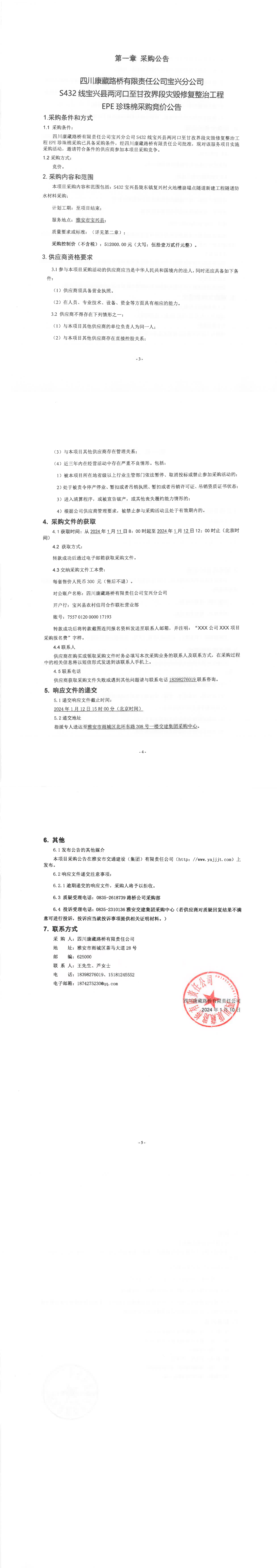 四川康藏路桥有限责任公司宝兴分公司S432线宝兴县两河口至甘孜界段灾毁修复整治工程EPE珍珠棉采购竞价公告