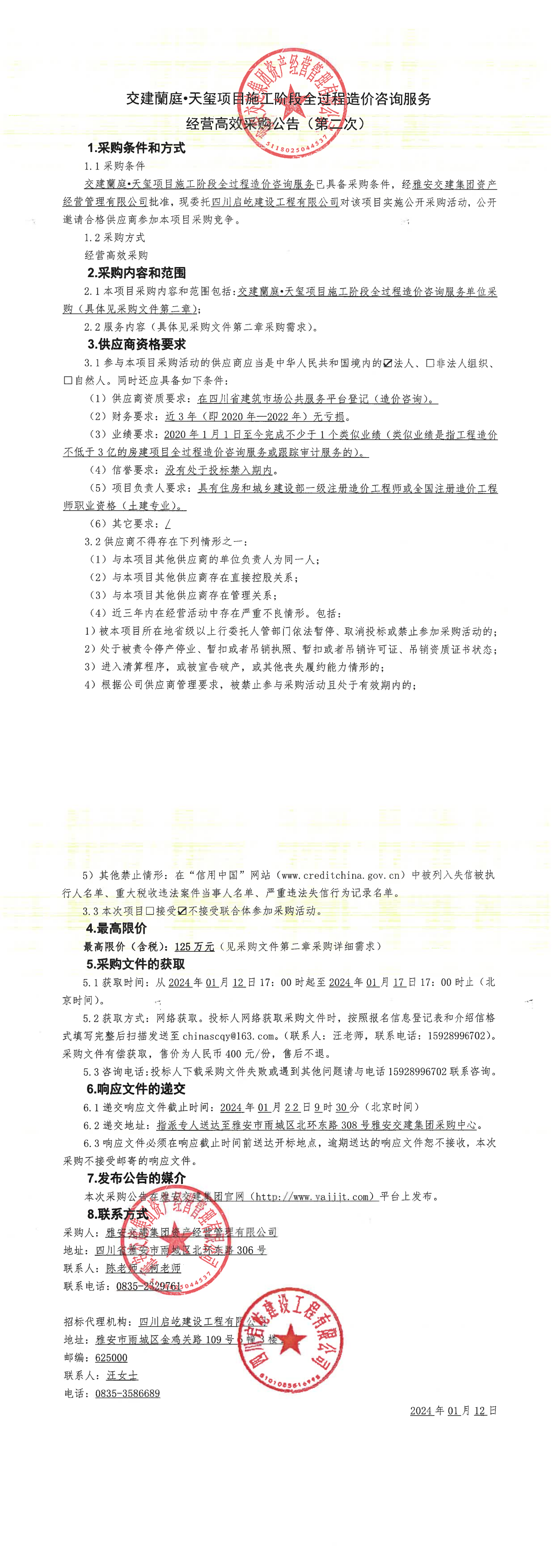 米兰体育-米兰(中国)官网 资产经营管理有限公司交建蘭庭·天玺项目施工阶段全过程造价咨询服务经营高效采购公告(第二次)
