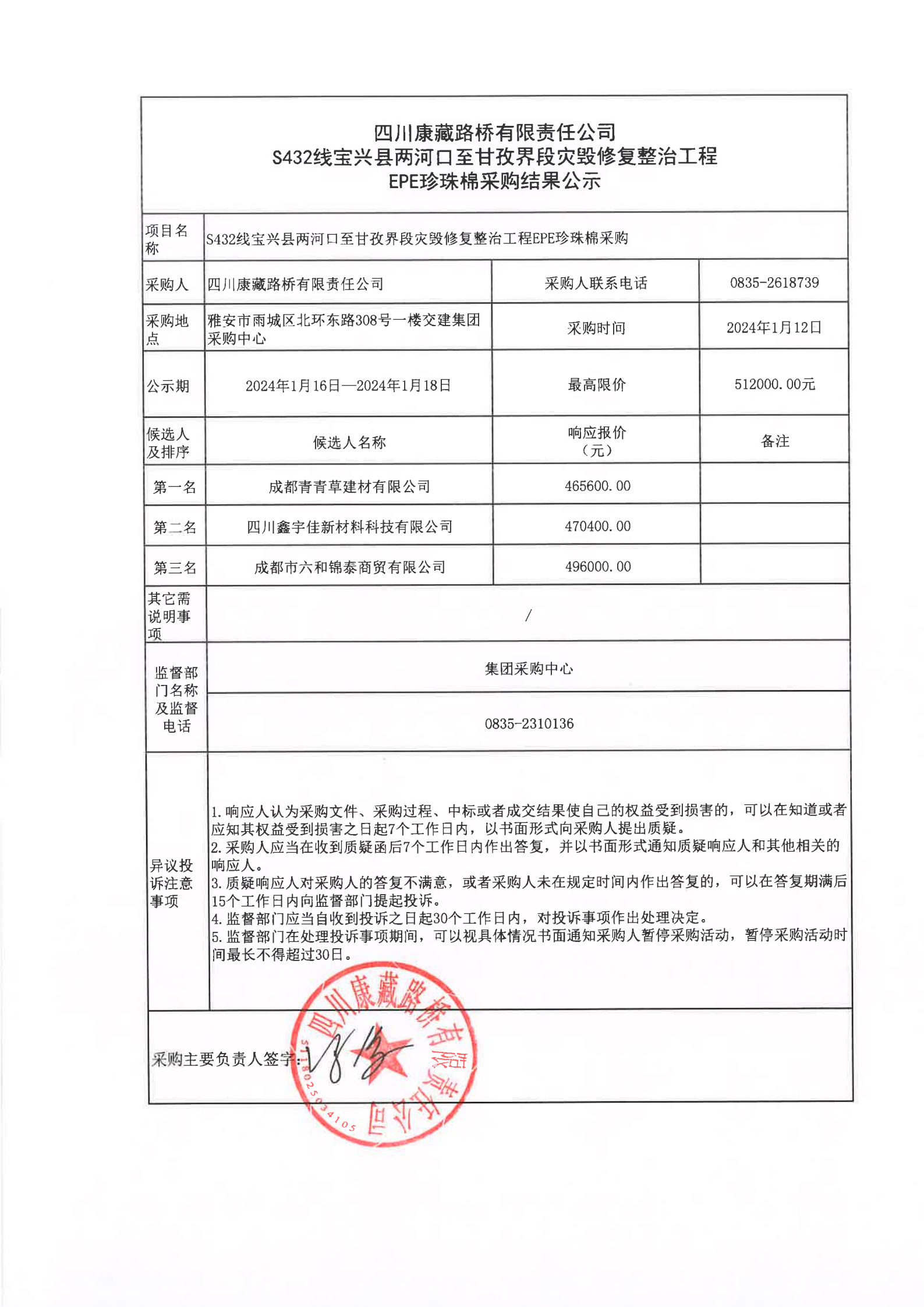 四川康藏路桥有限责任公司S432线宝兴县两河口至甘孜界段灾毁修复整治工程EOE珍珠棉采购结果公示