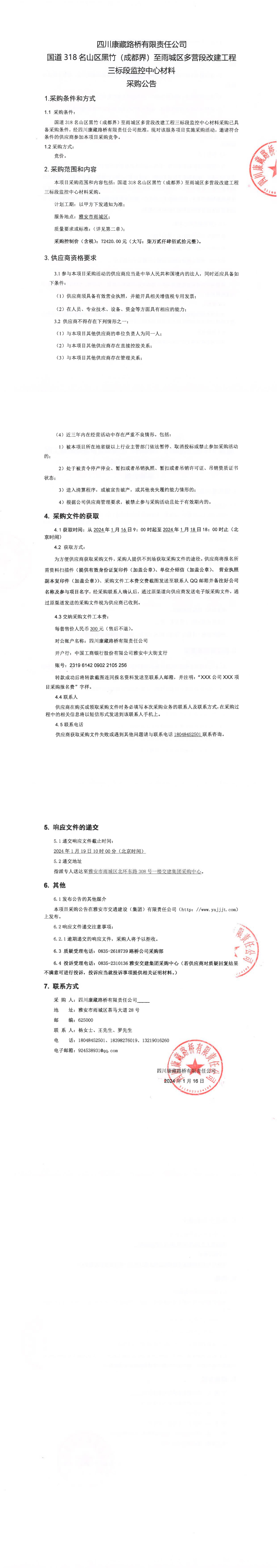 四川康藏路桥有限责任公司国道318名山区黑竹(成都界)至雨城区多营段改建工程三标段监控中心材料采购公告