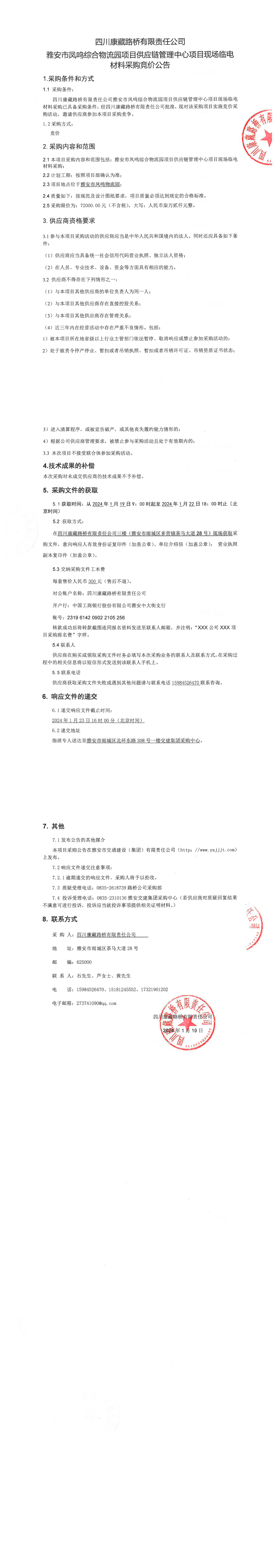四川康藏路桥有限责任公司雅安市凤鸣综合物流园项目供应链管理中心项目现场临电材料采购竞价公告