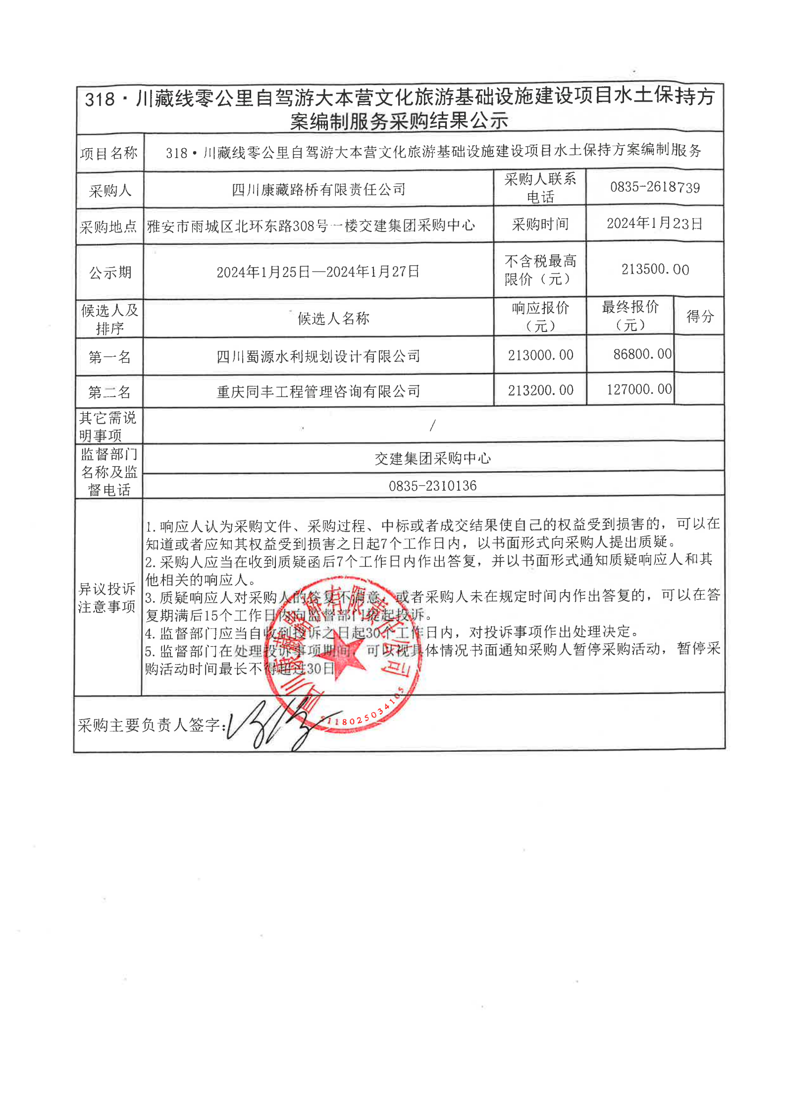 四川康藏路桥有限责任公司318·川藏线零公里自驾游大本营文化旅游基础设施建设项目水土保持方案编制服务采购结果公示