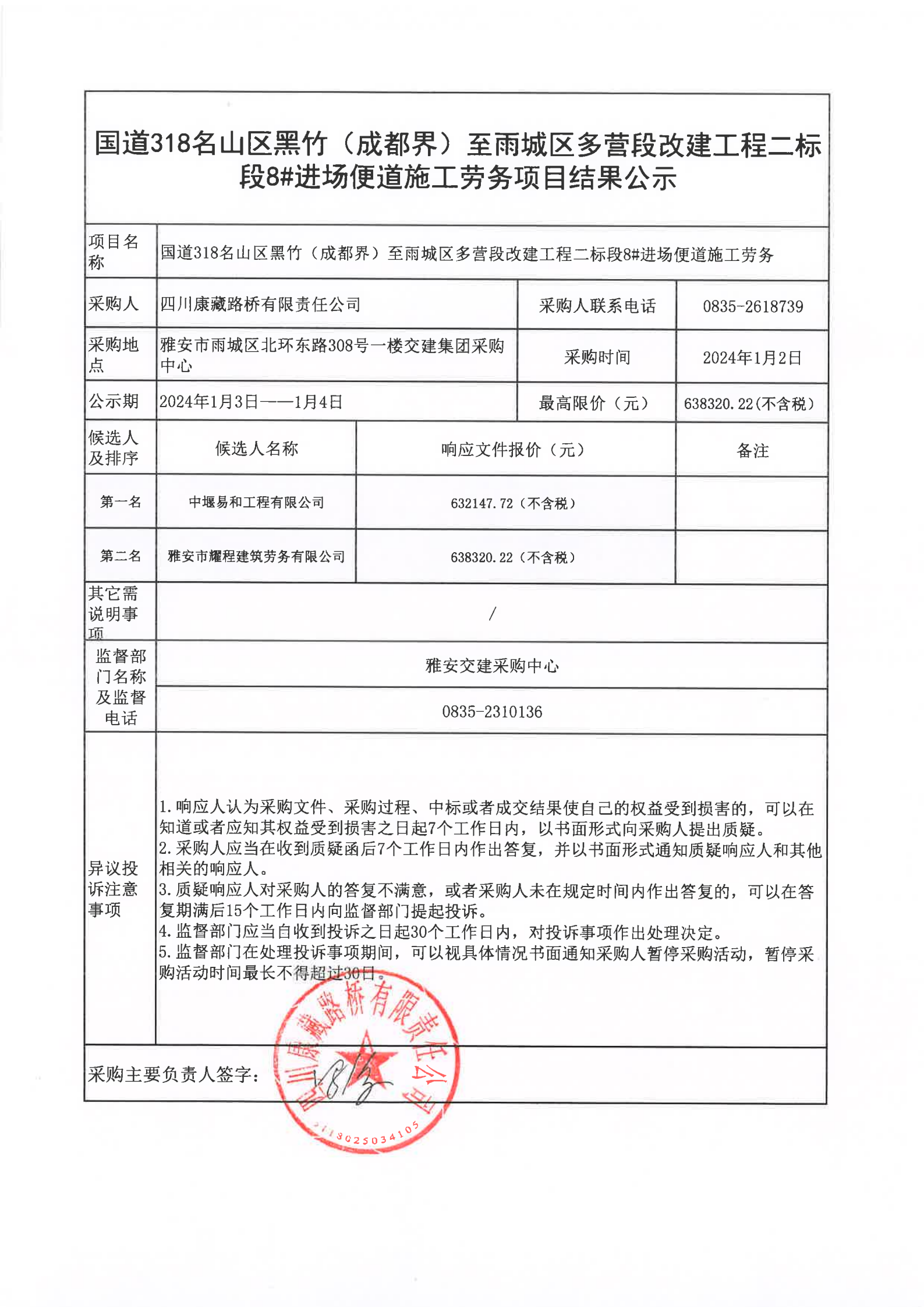 四川康藏路桥有限责任公司国道318名山区黑竹(成都界)至雨城区多营段改建工程二标段8#进场便道施工劳务项目结果公示