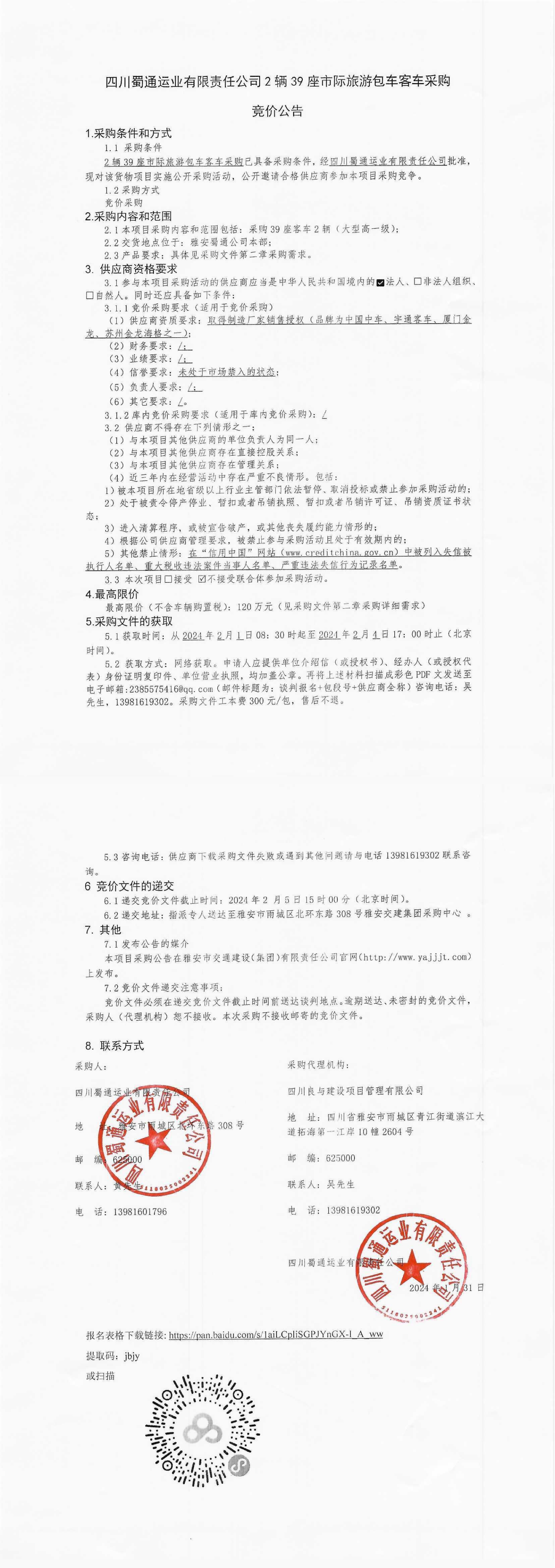 四川蜀通运业有限责任公司2辆39座市际旅游包车客车采购竞价公告