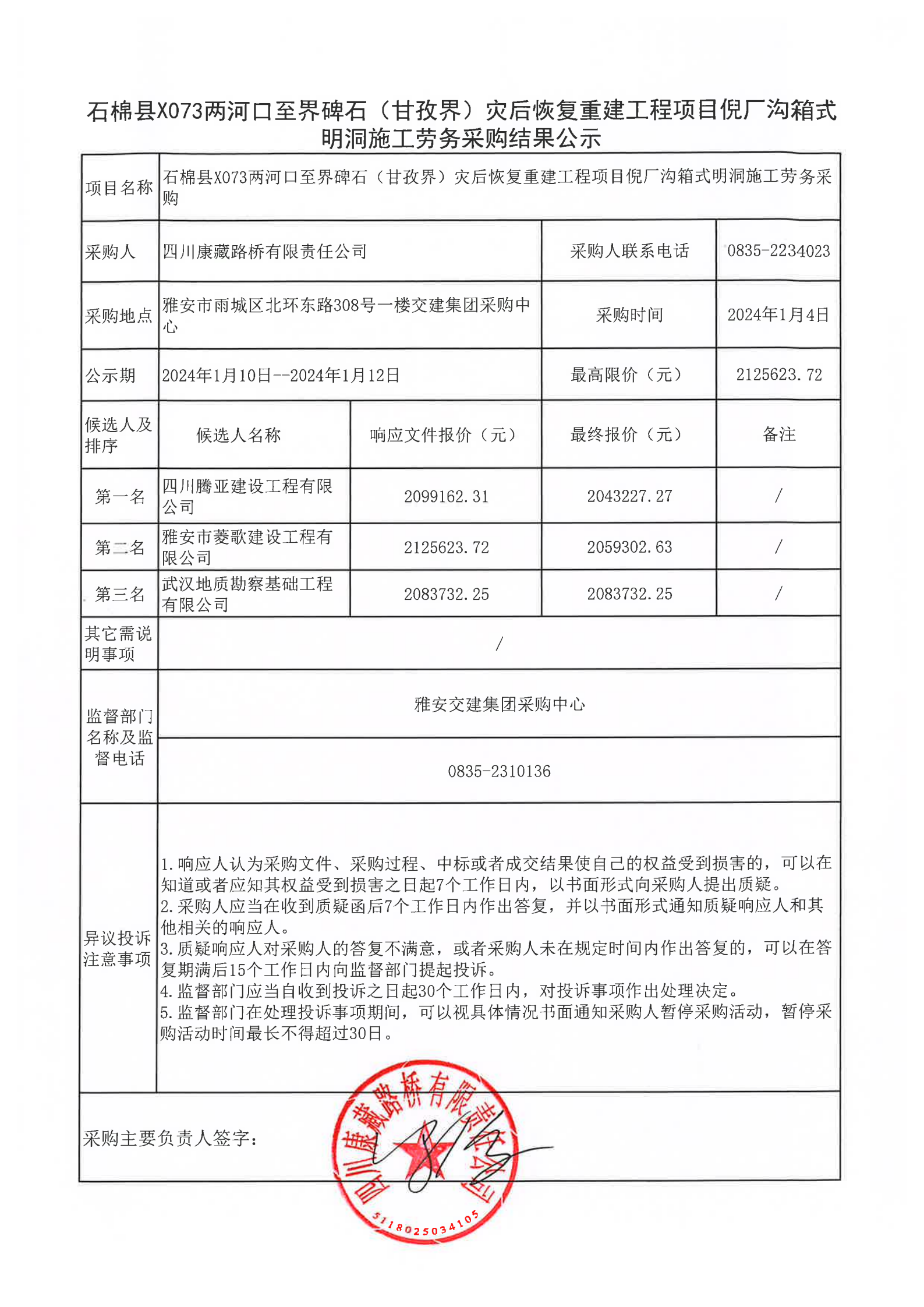四川康藏路桥有限责任公司石棉县X073两河口至界碑石(甘孜界)灾后恢复重建工程项目倪厂沟箱式明洞施工劳务采购结果公示