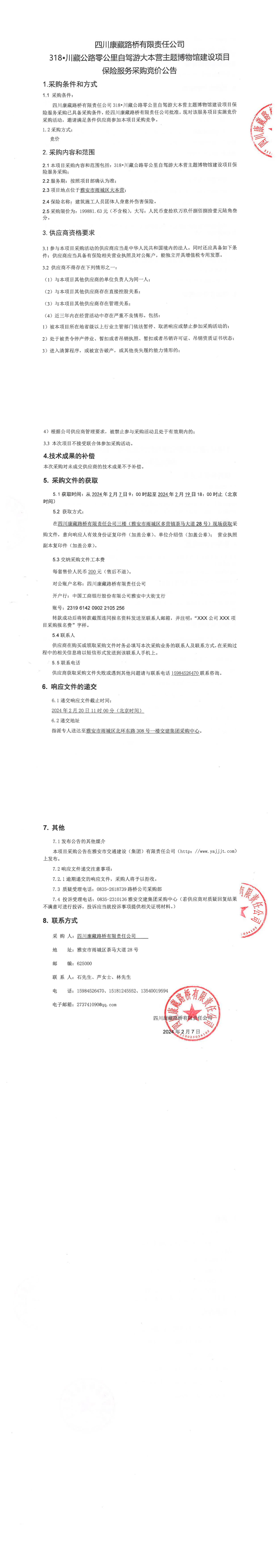 四川康藏路桥有限责任公司318•川藏公路零公里自驾游大本营主题博物馆建设项目保险服务采购公告
