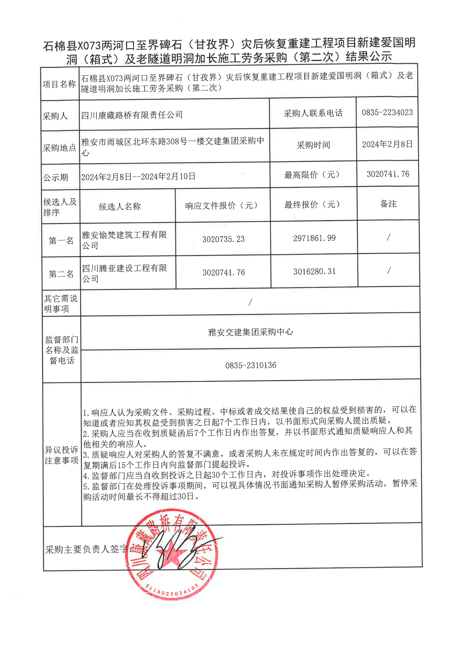四川康藏路桥有限责任公司石棉县X073两河口至界碑石(甘孜界)灾后恢复重建工程项目新建爱国明洞(箱式)及老隧道明洞加长施工劳务采购(第二次)结果公示