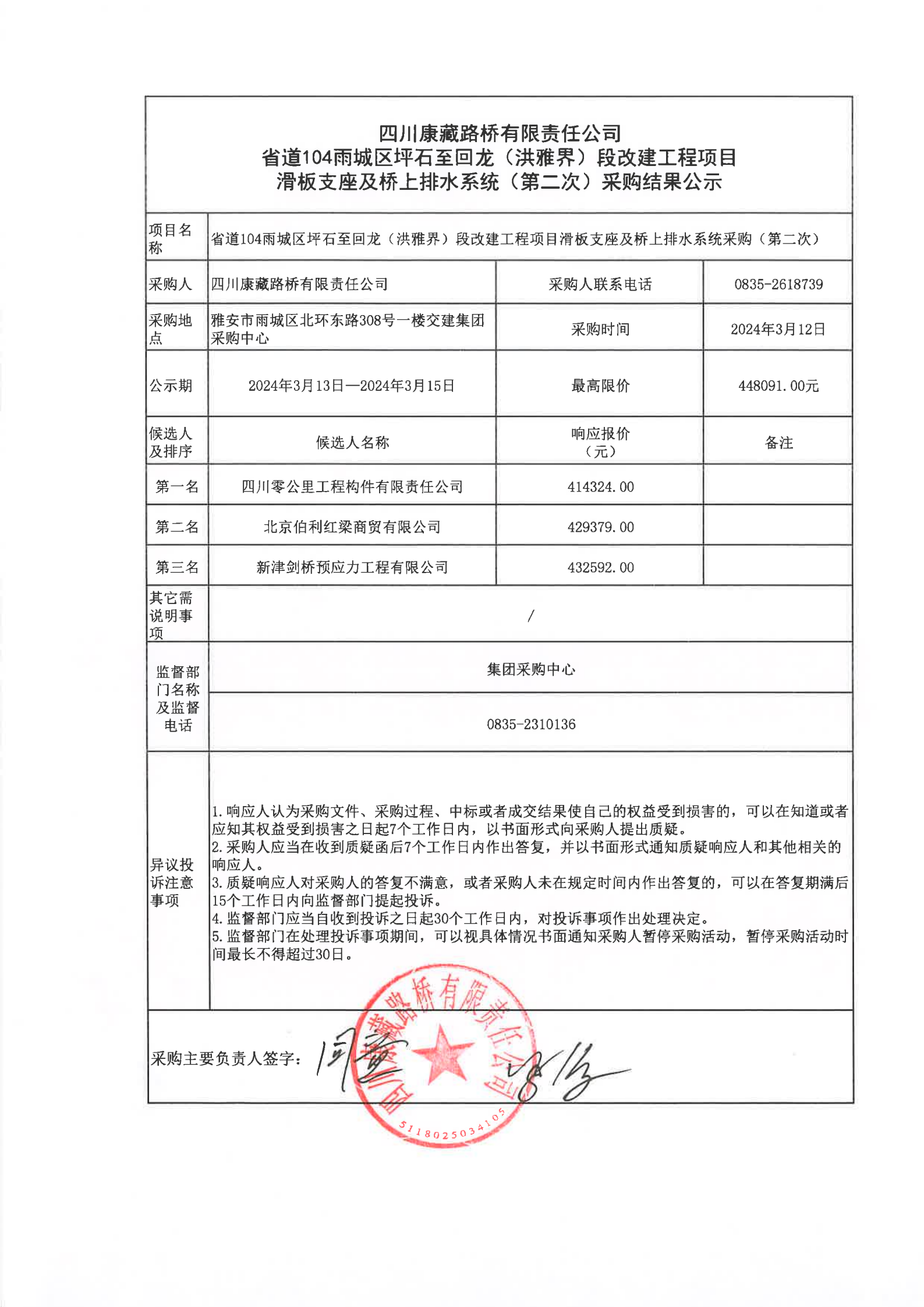 四川康藏路桥有限责任公司省道104雨城区坪石至回龙(洪雅界)段改建工程项目滑板支座及桥上排水系统(第二次)采购结果公示