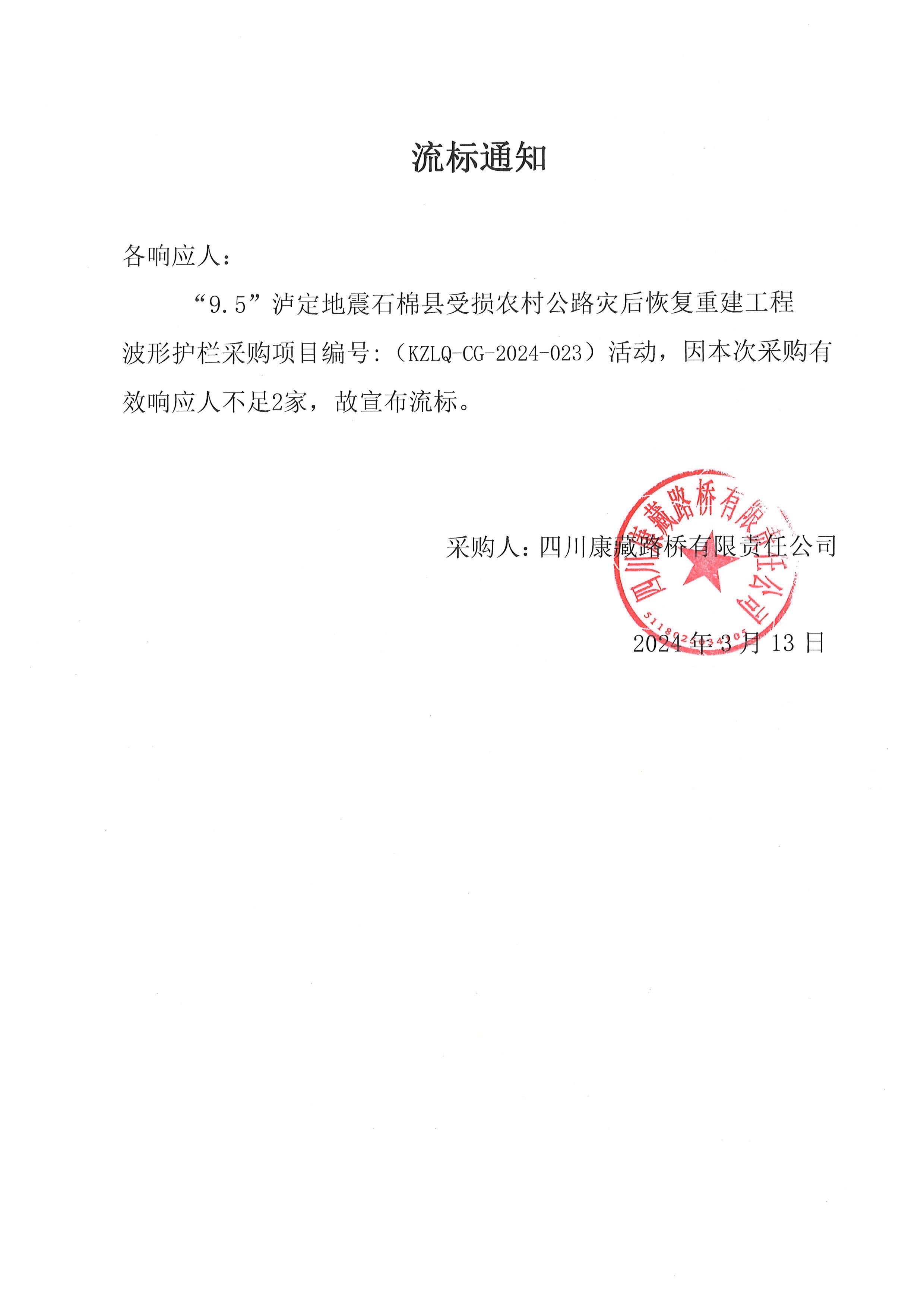 四川康藏路桥有限责任公司“9.5”泸定地震石棉县受损农村公路灾后恢复重建工程波形护栏采购流标通知