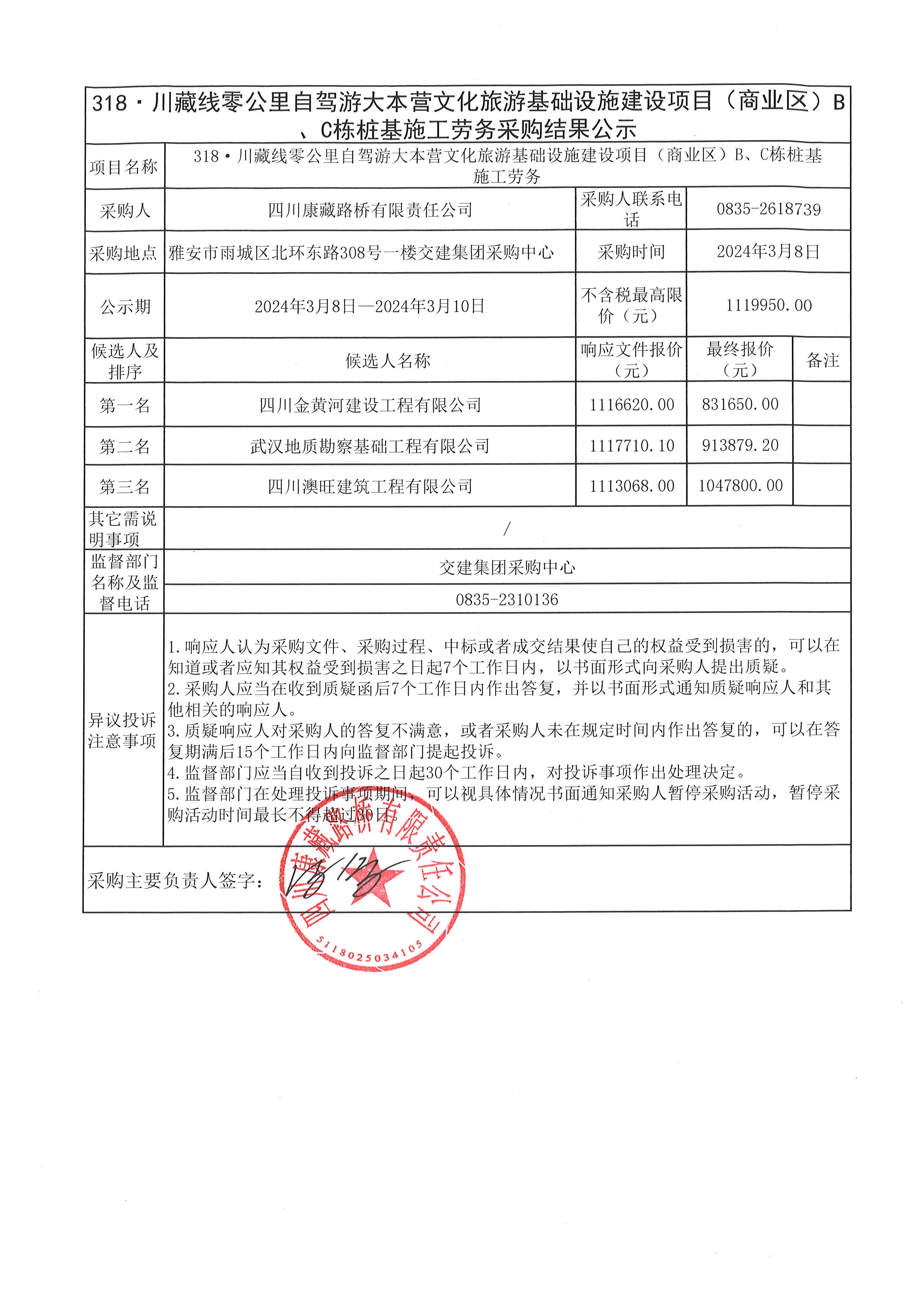 四川康藏路桥有限责任公司318·川藏线零公里自驾游大本营文化旅游基础设施建设项目(商业区)B、C栋预制管桩采购结果公示