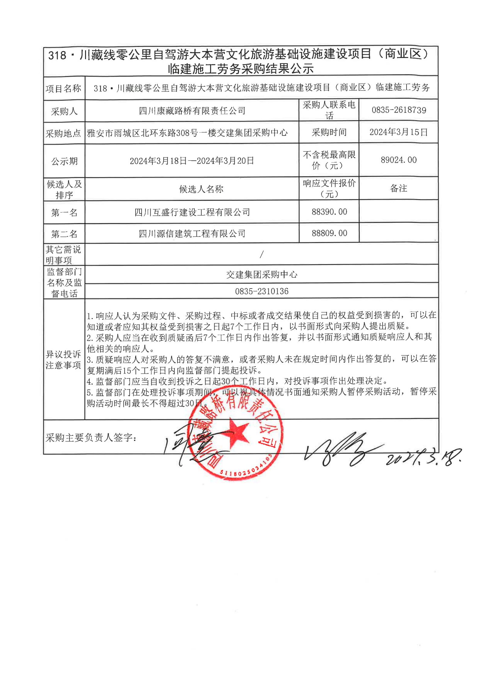 四川康藏路桥有限责任公司318·川藏线零公里自驾游大本营文化旅游基础设施建设项目(商业区)临建施工劳务结果公示
