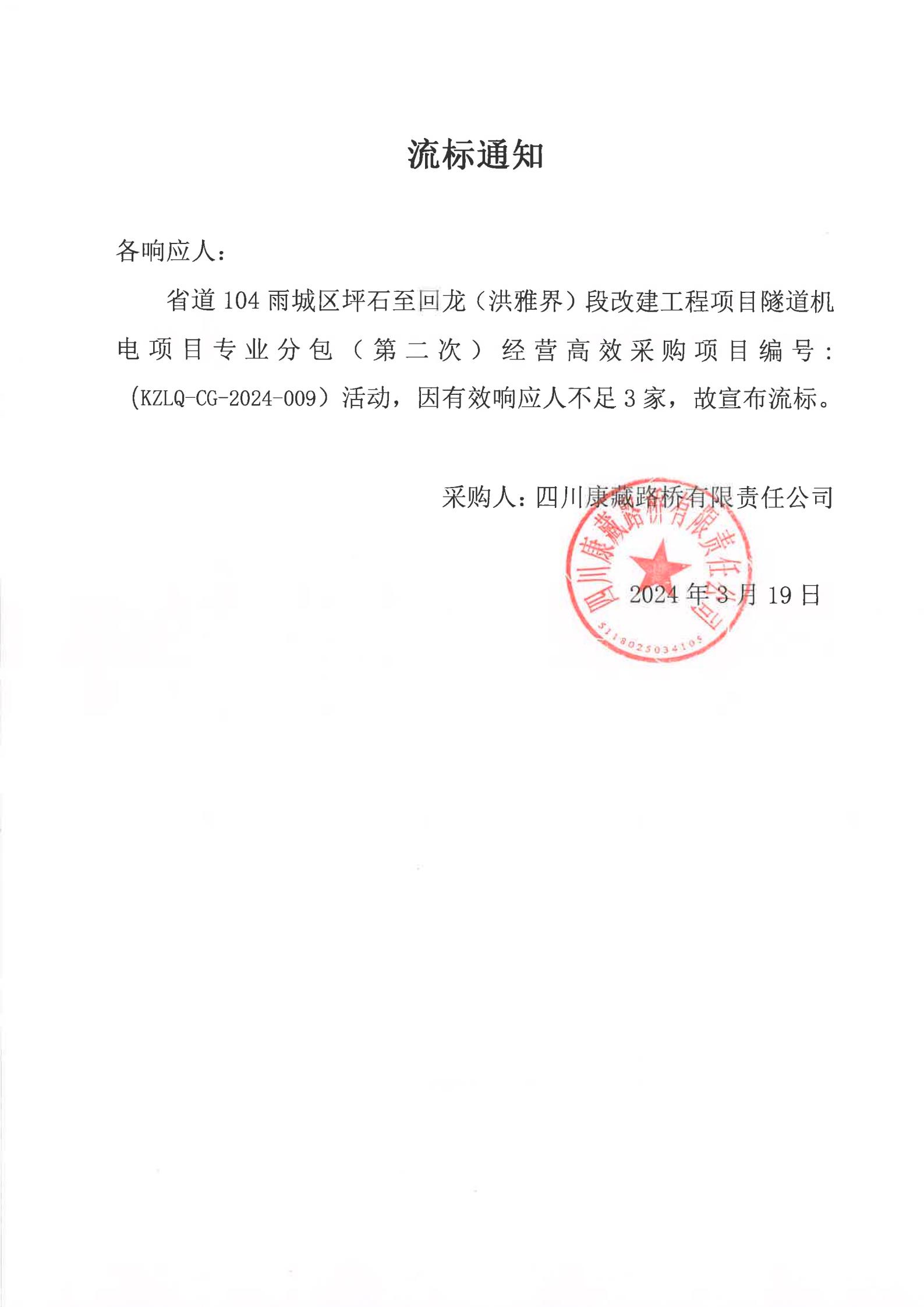 四川康藏路桥有限责任公司省道104雨城区坪石至回龙(洪雅界)段改建工程项目隧道机电项目专业分包经营高效采购(第二次)流标通知