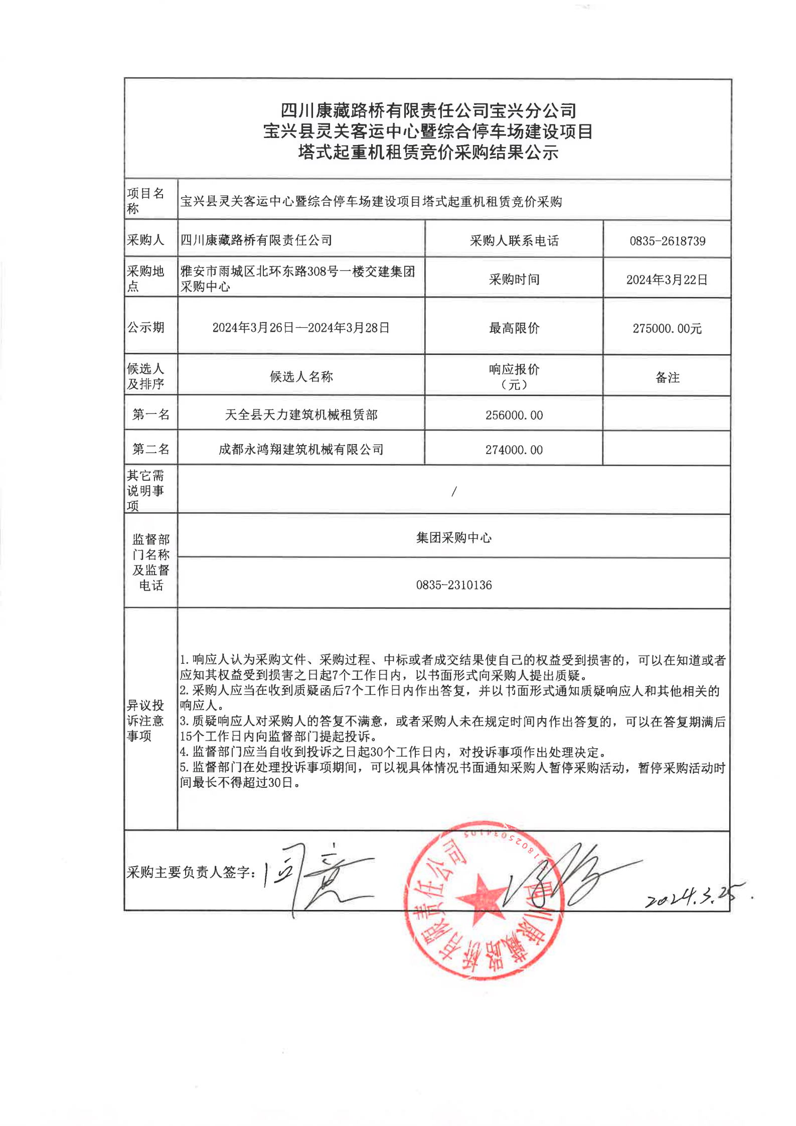 四川康藏路桥有限责任公司宝兴县灵关客运中心暨综合停车场建设项目塔式起重机租赁竞价采购结果公示