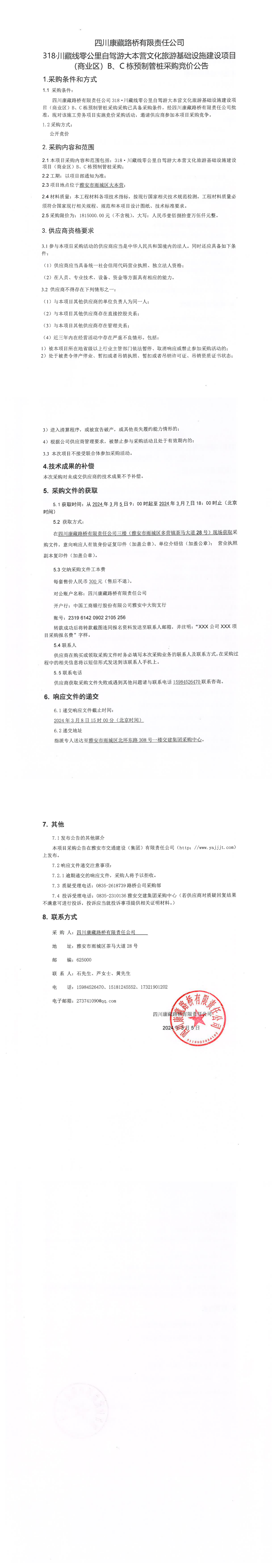 四川康藏路桥有限责任公司318·川藏公路零公里自驾游大本营文化旅游基础设施建设项目(商业区)B\C栋预制管桩采购竞价公告