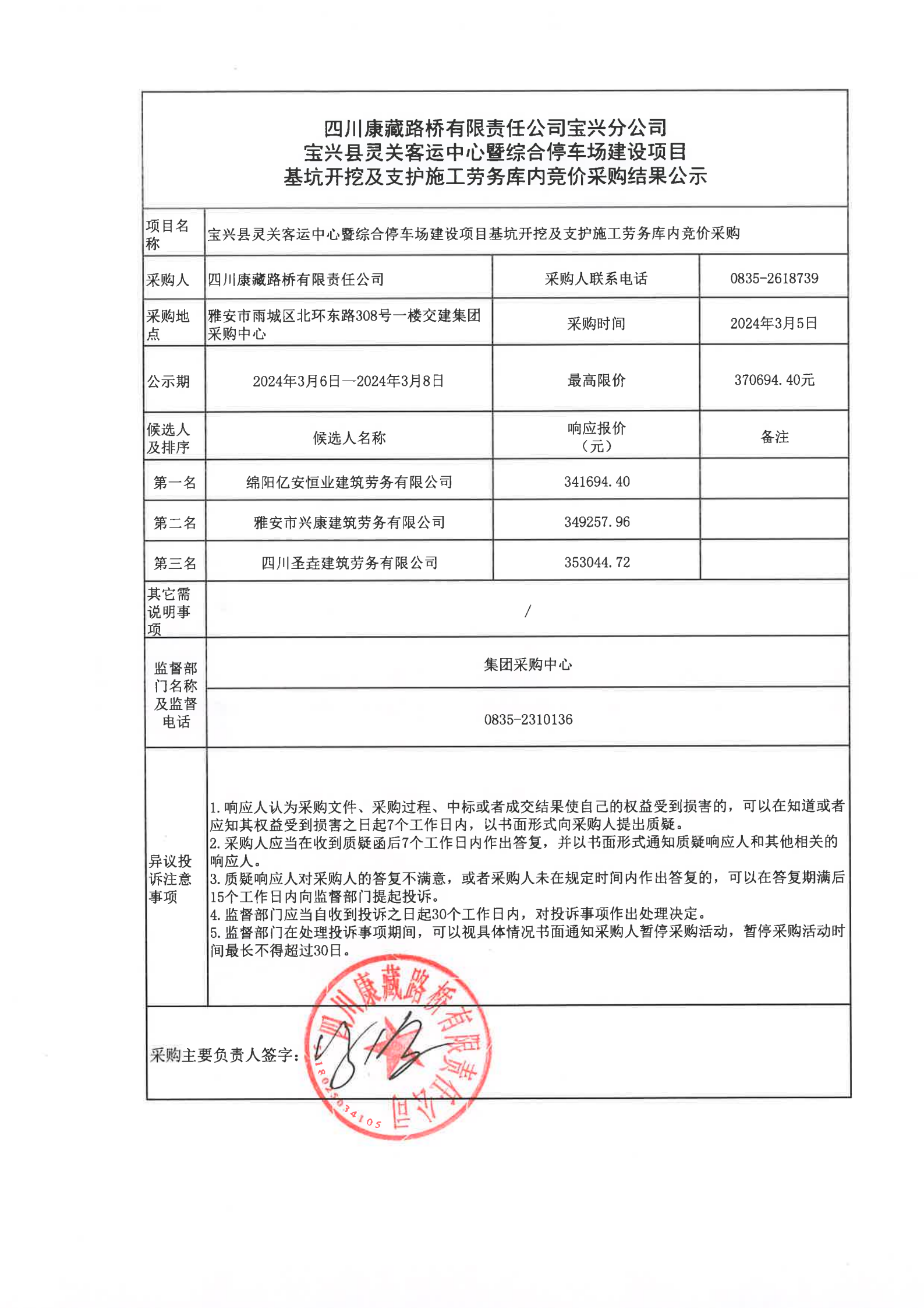 四川康藏路桥有限责任公司宝兴县灵关客运站中心暨综合停车场建设项目基坑降水施工劳务库内竞价采购结果公示