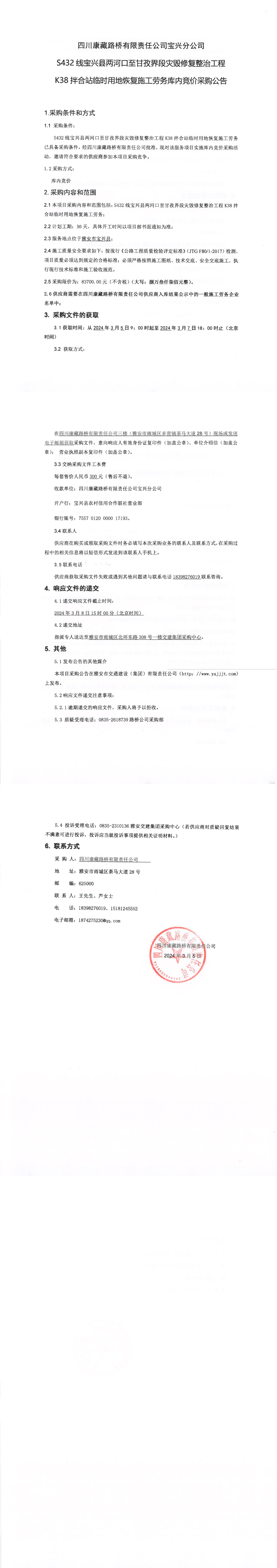 四川康藏路桥有限责任公司S432线宝兴县两河口至甘孜界段灾毁修复整治工程K38拌合站临时用地恢复施工劳务库内竞价采购公告