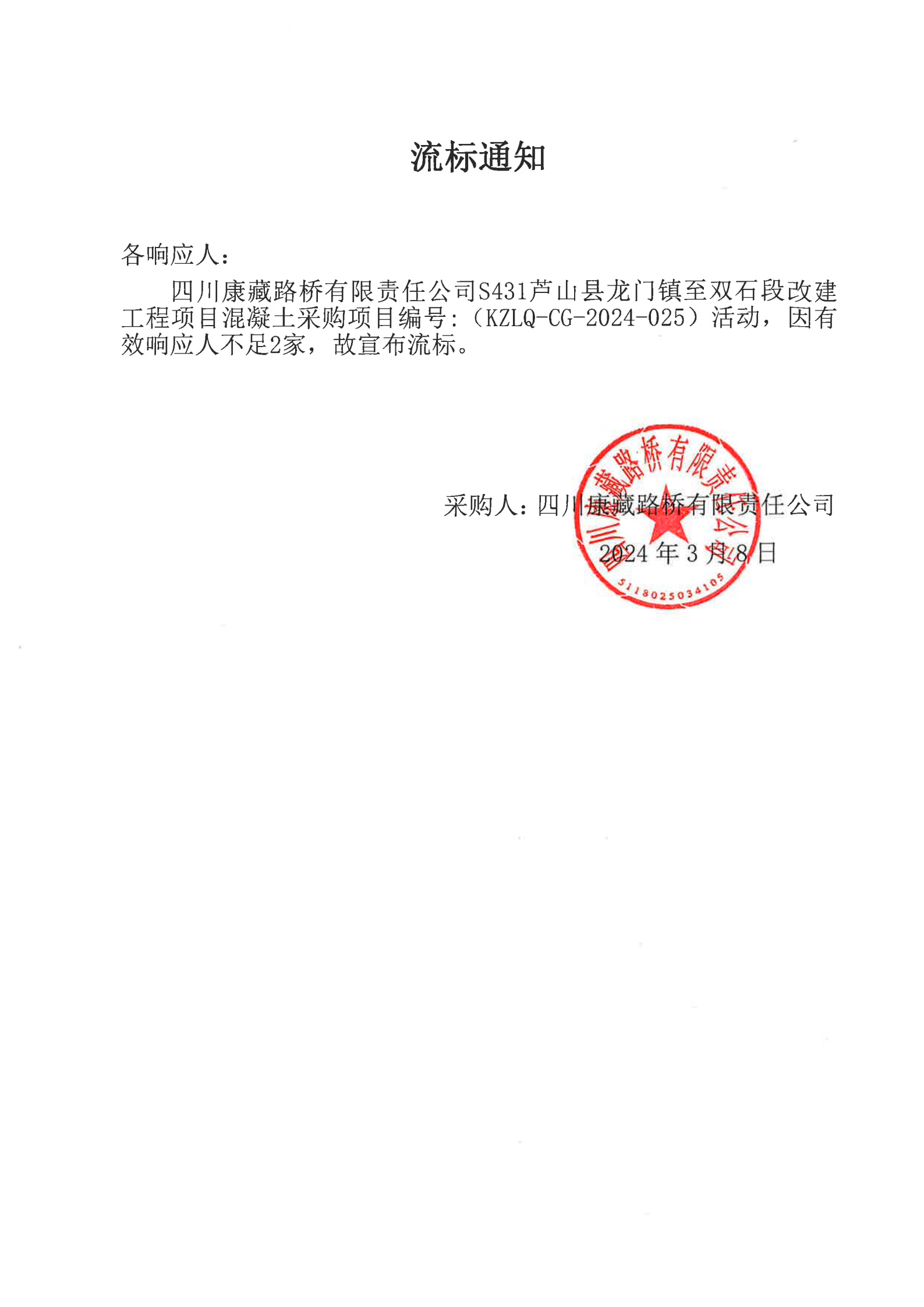 四川康藏路桥有限责任公司S431芦山县龙门镇至双石段改建工程项目混凝土采购流标通知