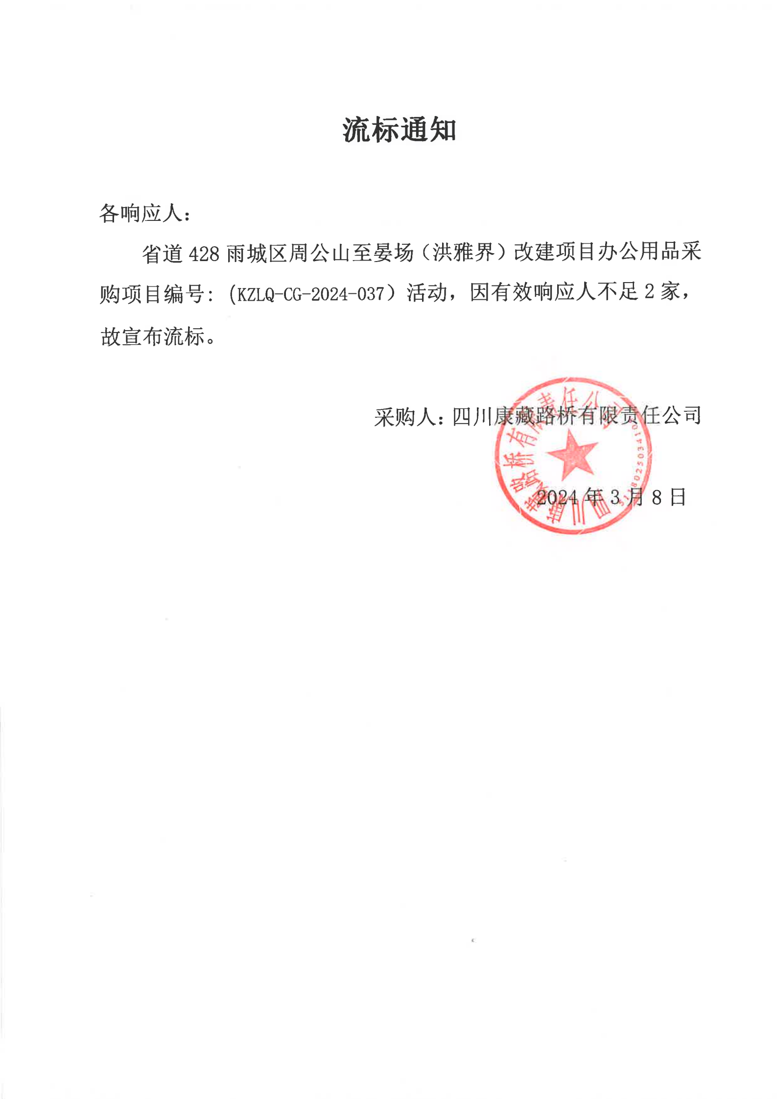 四川康藏路桥有限责任公司省道428雨城区周公山至晏场(洪雅界)改建项目办公用品采购流标通知