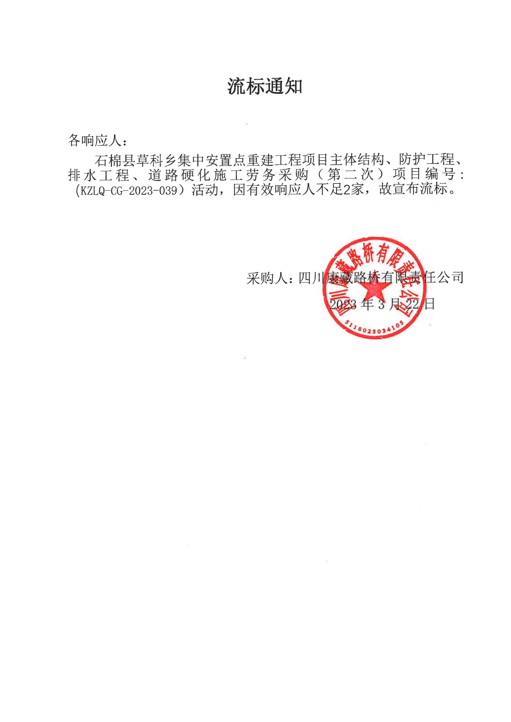 四川康藏路桥有限责任公司石棉草科乡集中安置点重建工程项目主体结构、防护工程、排水工程、道路硬化施工劳务采购流标通知(第二次)