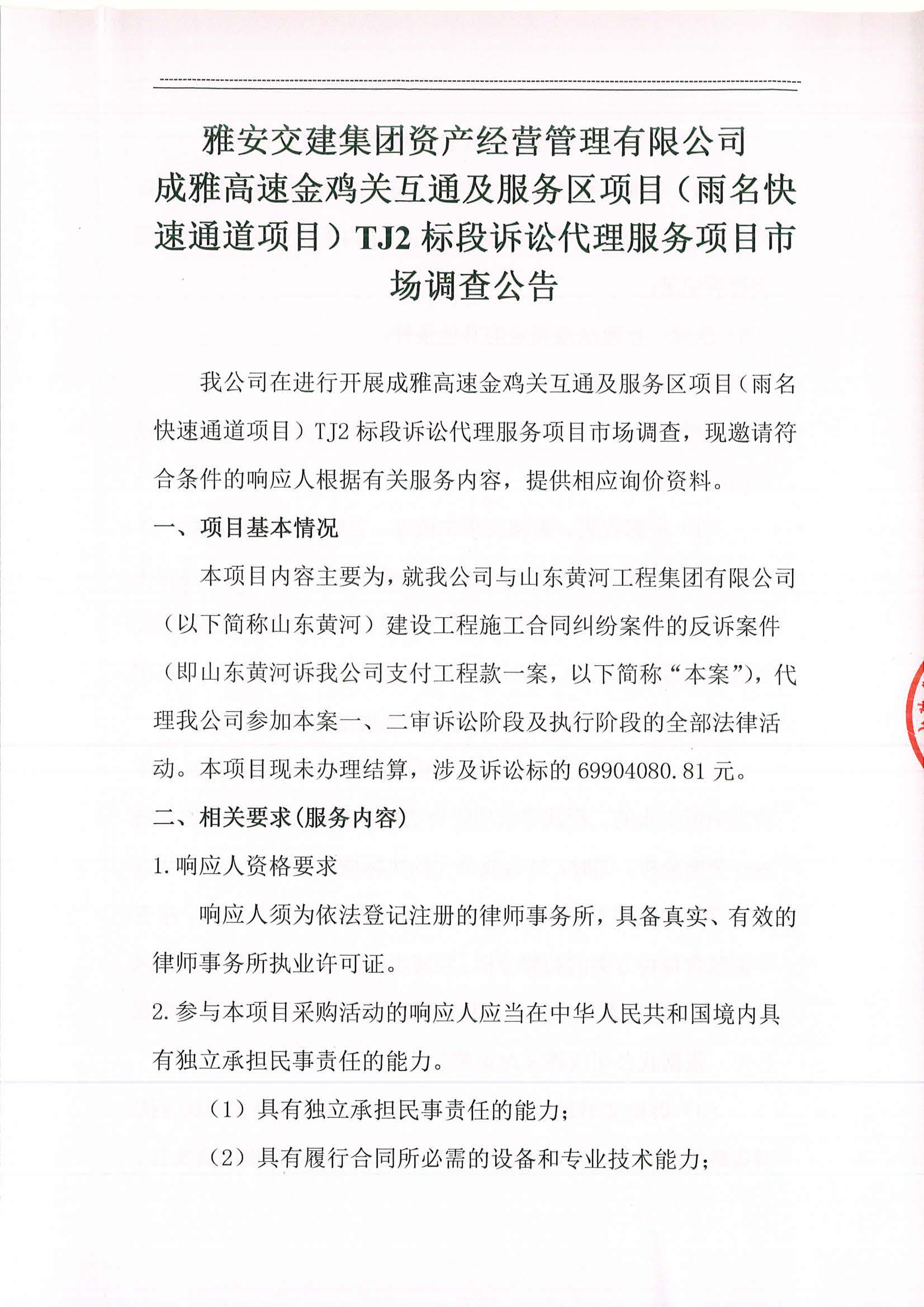米兰体育-米兰(中国)官网 资产经营管理有限公司成雅高速金鸡关互通及服务区项目(雨名快速通道项目)TJ2标段诉讼代理服务项目市场调查公告