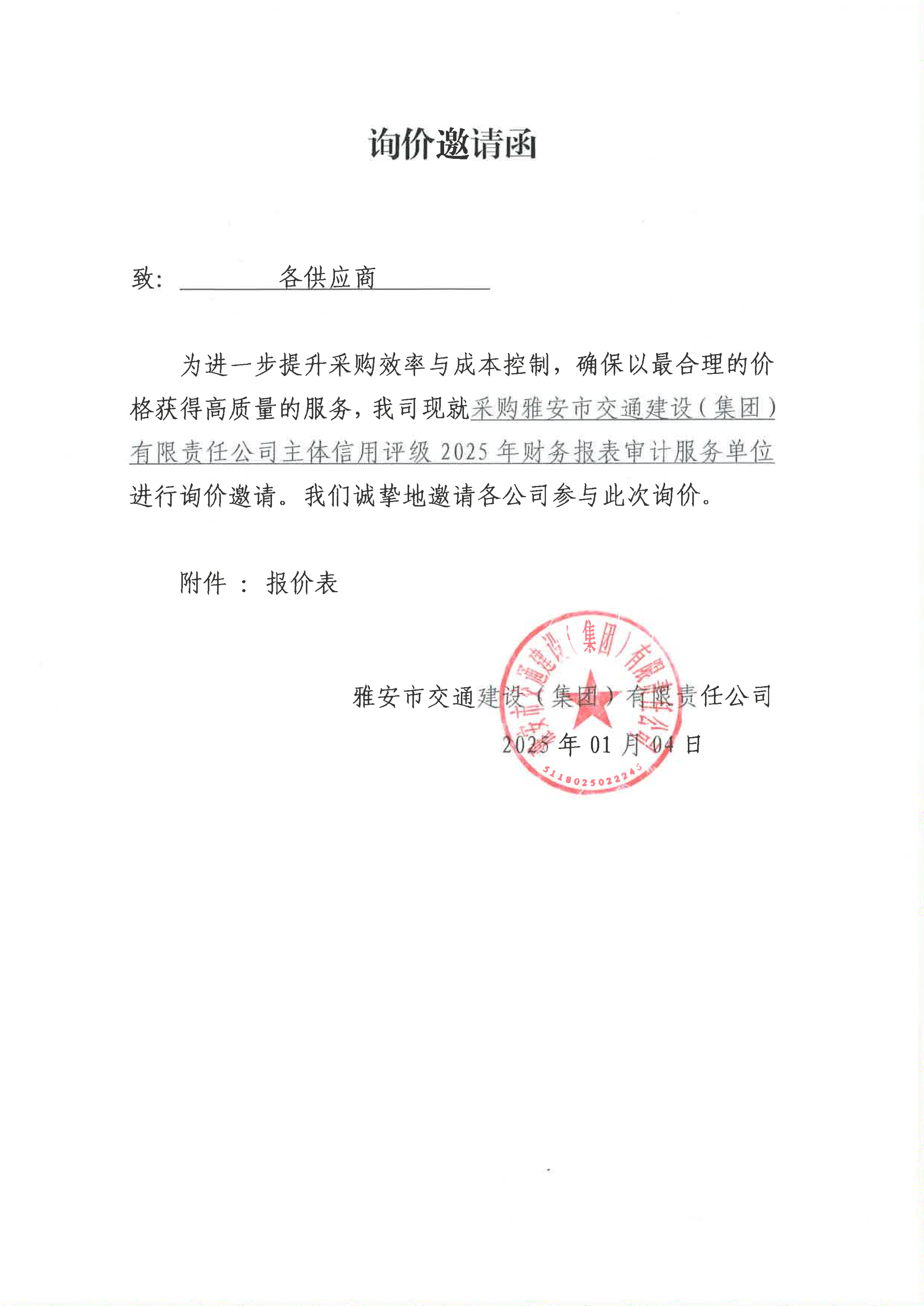 关于采购米兰体育-米兰(中国)官网 主体信用评级2025年财务报表审计服务限价的询价函
